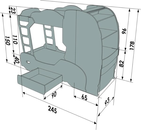 Das Kinderbett misst 245 x 90 x 178 cm und wird inklusive Lattenrost, Schraubenset, Schrank, Leiter sowie Gebrauchsanleitung geliefert. Die Liegefläche beträgt 90 x 180 cm. Matratze nicht im Lieferumfang enthalten. -