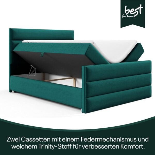 Price range: 769,99 € through 819,99 €- ✔️ [𝐏𝐫𝐞𝐦𝐢𝐮𝐦-𝐊𝐨𝐦𝐟𝐨𝐫𝐭 & 𝐄𝐫𝐠𝐨𝐧𝐨𝐦𝐢𝐬𝐜𝐡𝐞 𝐔𝐧𝐭𝐞𝐫𝐬𝐭ü𝐭𝐳𝐮𝐧𝐠] Das Best For Home Boxspringbett Trinity K-14 kombiniert einen langlebigen 7-Zonen-Bonell-Federkern mit einer H3-Komfortmatratze (18 cm) und einem 7 cm starken PUR-Schaum-Topper. Diese Kombination sorgt für perfekte Druckentlastung, optimale Körperanpassung und ein harmonisches Liegegefühl. Erhältlich u.a. als Boxspringbett 140×200, 160×200 oder 180×200 sowie als Bett 180×200 mit Matratze – ideal für jedes Schlafzimmer.