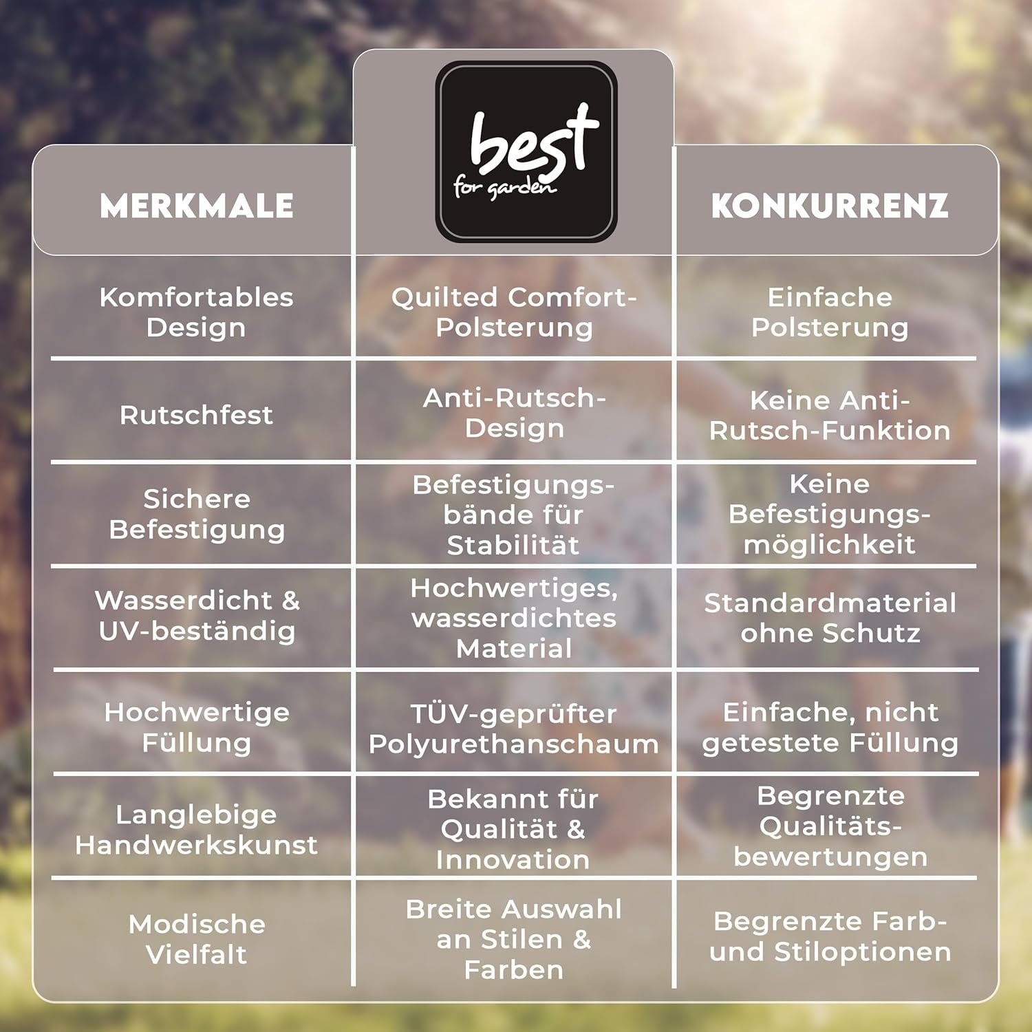Langlebig und UV-beständig: Der Bezug besteht aus hochwertigem, UV-beständigem Stoff, der auch bei starker Sonneneinstrahlung farbecht bleibt. Dadurch eignet sich das Kissen optimal für die Nutzung im Freien – auf der Terrasse, dem Balkon oder im Garten.