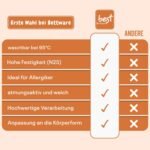 Das Produkt verfügt über eine Infografik mit fünf orangefarbenen Symbolen: Komfort, leichte, atmungsaktive Baumwolle, erstklassige Qualität und ergonomische Unterstützung. Text auf Deutsch beschreibt jedes Merkmal