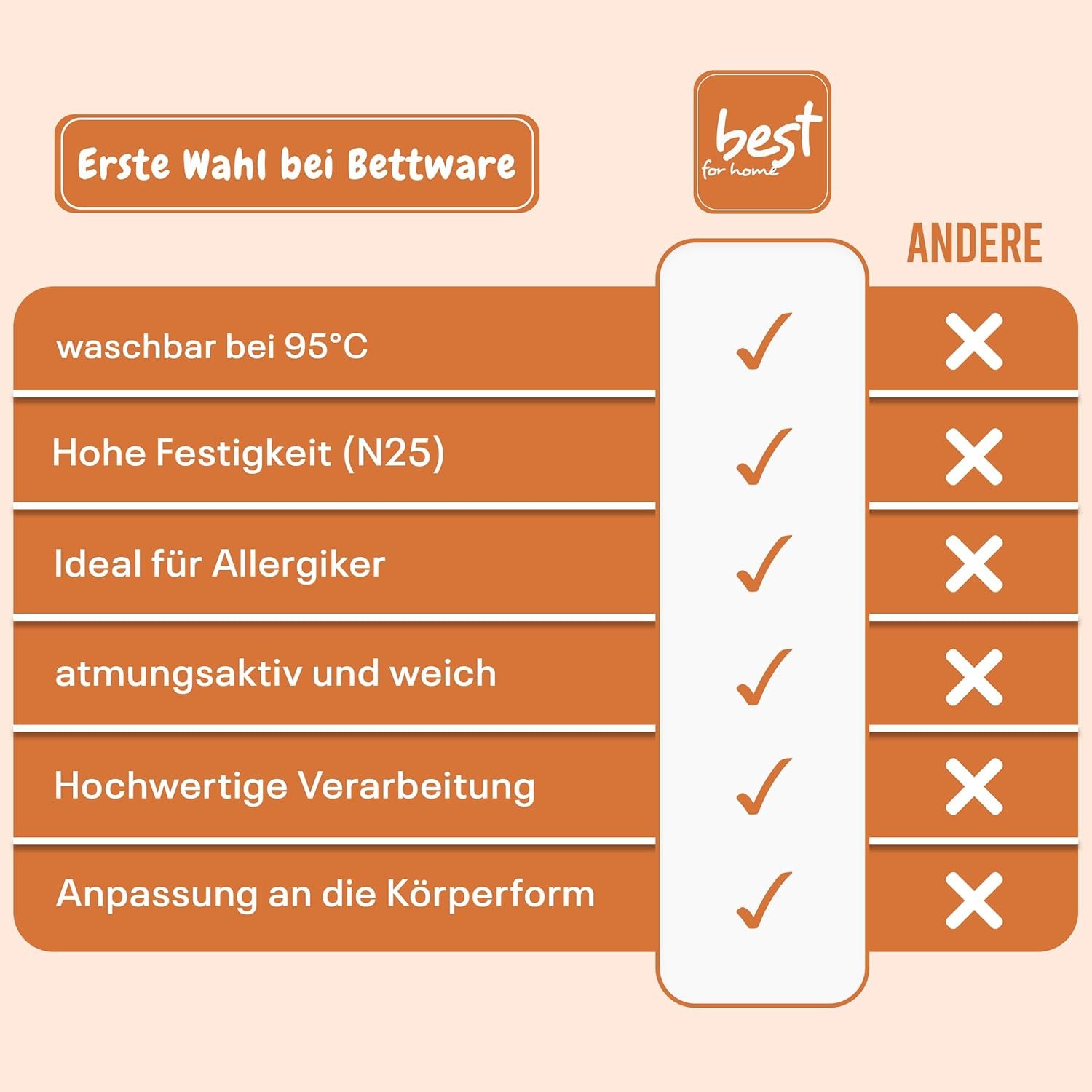 Infografik in Orange und Weiß, die hypoallergene Materialien für Allergiker hervorhebt und durch die Minimierung von Allergenen einen gesunden Schlaf fördert