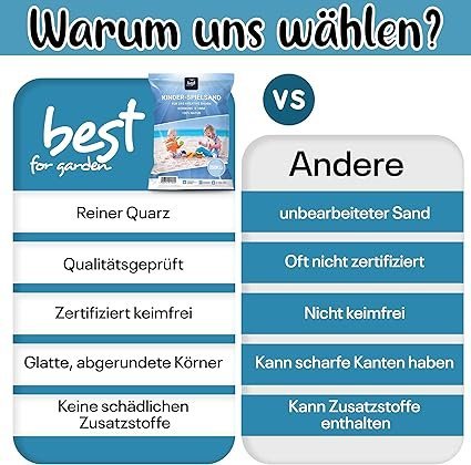 Unser hochwertiger Spielsand erfüllt die Normen EN 12620:2002 + A1, 2008 sowie EN 13139:2002. Er bietet Kindern ein sicheres und unterhaltsames Spielerlebnis – ideal für jeden Sandkasten und zum Spielen im Freien. Verfügbar in praktischen 5 kg- bis 25 kg-Säcken, sorgt er dafür, dass Ihr Sand immer bereit für unvergessliche Abenteuer im Freien ist! Genießen Sie sorgloses Spielen und lassen Sie die Fantasie Ihrer Kinder blühen!”” - “Premium Quarzsand für sicheren Spielspaß: