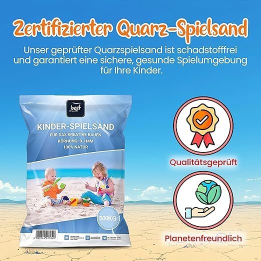Unser hochwertiger Spielsand erfüllt die Normen EN 12620:2002 + A1, 2008 sowie EN 13139:2002. Er bietet Kindern ein sicheres und unterhaltsames Spielerlebnis – ideal für jeden Sandkasten und zum Spielen im Freien. Verfügbar in praktischen 5 kg- bis 25 kg-Säcken, sorgt er dafür, dass Ihr Sand immer bereit für unvergessliche Abenteuer im Freien ist! Genießen Sie sorgloses Spielen und lassen Sie die Fantasie Ihrer Kinder blühen!”” - “Premium Quarzsand für sicheren Spielspaß: