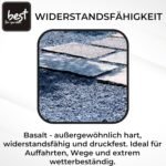 - 🌦️ Wetterfest und farbecht: Unser Naturstein trotzt mühelos allen Elementen. Basaltsplitt ist frostbeständig, sodass er auch strengen Wintern standhält, ohne zu reißen oder zu bröseln. Er ist zudem resistent gegen Streusalz, was ihn zu einer praktischen und langlebigen Option für den Einsatz in Einfahrten und auf Wegen macht. Die Farbechtheit des Basalts garantiert, dass die dunkle Tönung auch bei intensiver Sonneneinstrahlung und wechselnden Witterungsbedingungen erhalten bleibt. So bewahrt Ihr Gartenprojekt über Jahre hinweg seine ursprüngliche Schönheit.