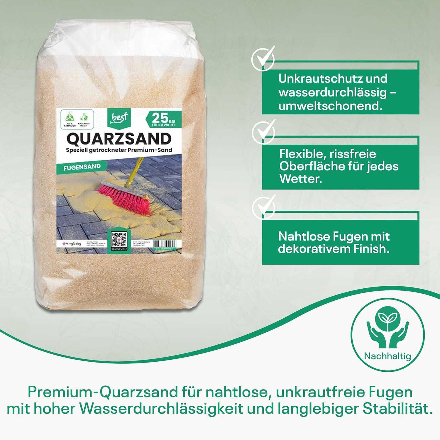 - ✔️【𝐅𝐞𝐢𝐧𝐞𝐫 𝐐𝐮𝐚𝐫𝐳𝐬𝐚𝐧𝐝 𝐟ü𝐫 𝐞𝐧𝐠𝐞 𝐅𝐮𝐠𝐞𝐧 – 𝟐𝟓 𝐤𝐠 𝐒𝐚𝐜𝐤】 Unser hochwertiger Fugensand in der Körnung 0,1-0,4 mm eignet sich ideal zur Einkehr in enge Pflasterfugen. Perfekt für Terrassen, Gehwege und Einfahrten – dieser Quarzsand stabilisiert Ihre Pflastersteine zuverlässig. Dank feiner Körnung füllt er selbst schmale Zwischenräume gleichmäßig und fest – für eine langlebige, unkrautfreie und optisch ansprechende Fläche im Außenbereich.