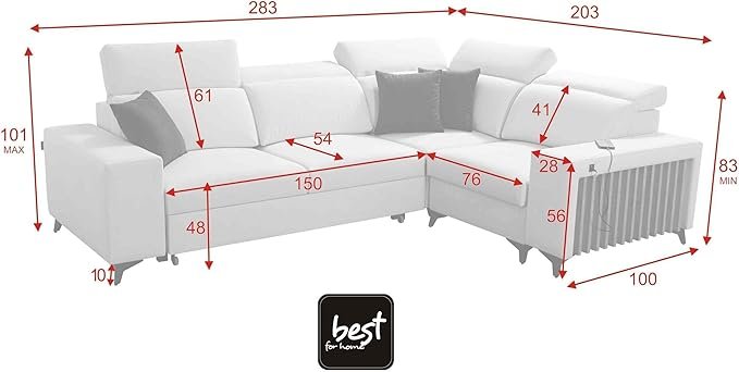 Designed for relaxation, the Benny corner sofa features generous proportions—283 cm wide, 100/203 cm deep, and a fold-out surface of 202 x 122 cm. Whether lounging, sitting, or sleeping, this sofa offers ample space for ultimate comfort and family gatherings.