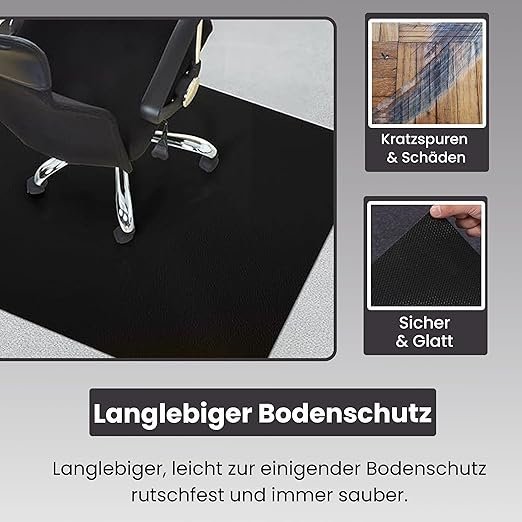 - ✅ 𝐕𝐢𝐞𝐥𝐬𝐞𝐢𝐭𝐢𝐠𝐞 𝐕𝐞𝐫𝐰𝐞𝐧𝐝𝐮𝐧𝐠 – 𝐈𝐝𝐞𝐚𝐥 𝐟ü𝐫 𝐣𝐞𝐝𝐞𝐬 𝐁ü𝐫𝐨: Diese Stuhlunterlage ist vielseitig einsetzbar – sowohl im Homeoffice als auch im Büro. Sie eignet sich perfekt als Schreibtischmatte für den Boden,für Schreibtischstuhl oder als Schutzmatte für Stühle in Ihrer Büroeinrichtung. Ideal für Drehstühle und Rollstühle, schützt diese Schutzmatte zuverlässig Parkett, Teppichböden und PVC-Böden. Sie ist auch hervorragend als Matte für Bürostühle oder Bodenmatte für Bürostuhl auf Teppich geeignet.