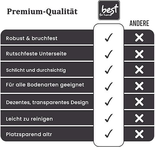 - ✅ 𝐑𝐮𝐭𝐬𝐜𝐡𝐟𝐞𝐬𝐭𝐞 𝐑ü𝐜𝐤𝐬𝐞𝐢𝐭𝐞 𝐟ü𝐫 𝐦𝐚𝐱𝐢𝐦𝐚𝐥𝐞 𝐒𝐭𝐚𝐛𝐢𝐥𝐢𝐭ä𝐭: Dank der strukturierten Rückseite bleibt diese rutschfeste Matte für Stuhl fest an ihrem Platz, auch bei intensiver Nutzung. Ob als Schutzmatte für Bürostuhl auf Teppichboden oder Bodenschutzmatte für Parkett, diese Bodenmatte verhindert das Verrutschen oder Wellen. Sie ist eine Bodenschutzmatte für Büros mit einer texturierten Unterseite, die für Computerstühle und Bürostühle auf verschiedenen Bodenarten optimalen Halt bietet. Die Anti-Rutsch-Eigenschaft sorgt dafür, dass die Matte immer an ihrem Platz bleibt.