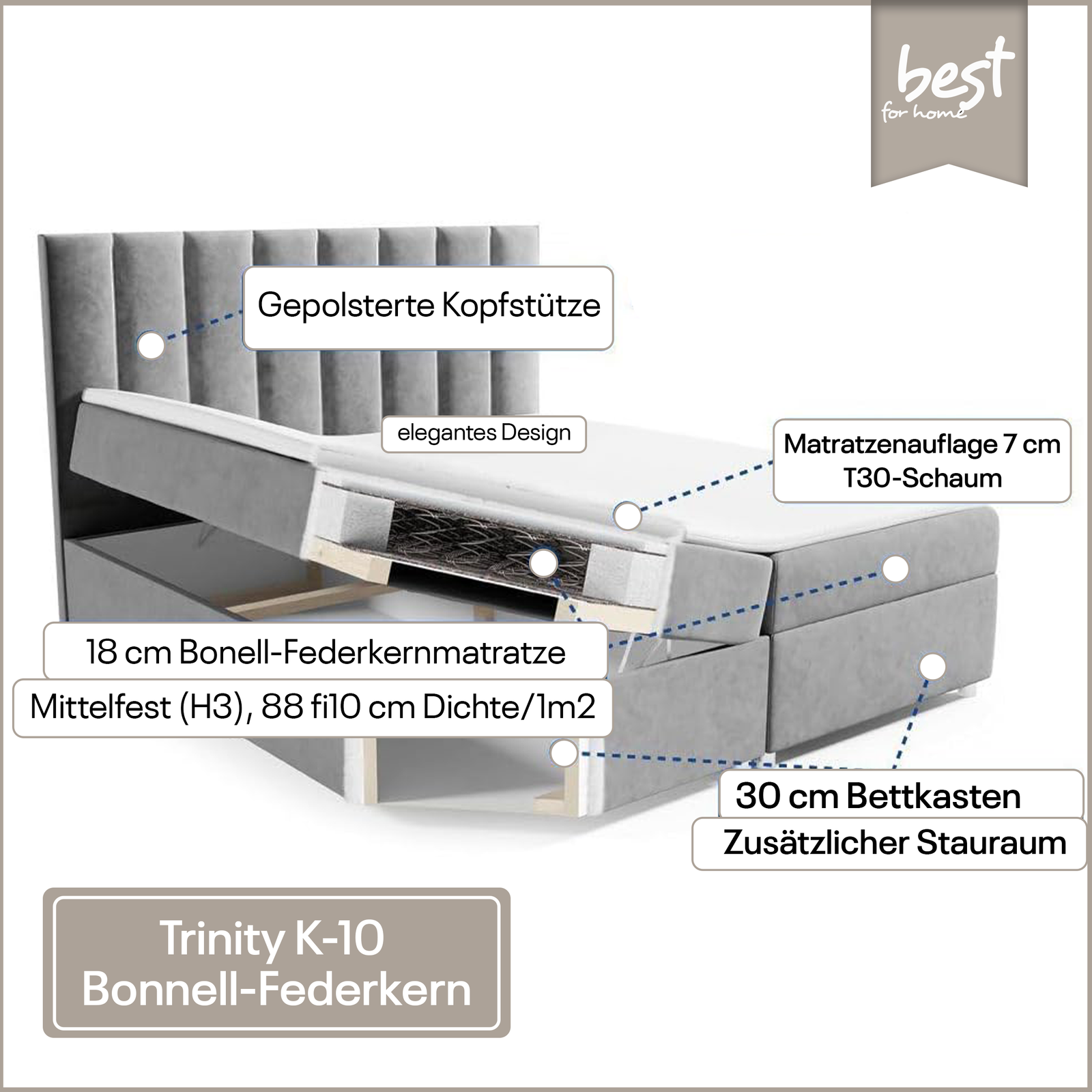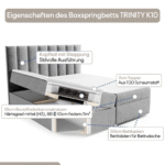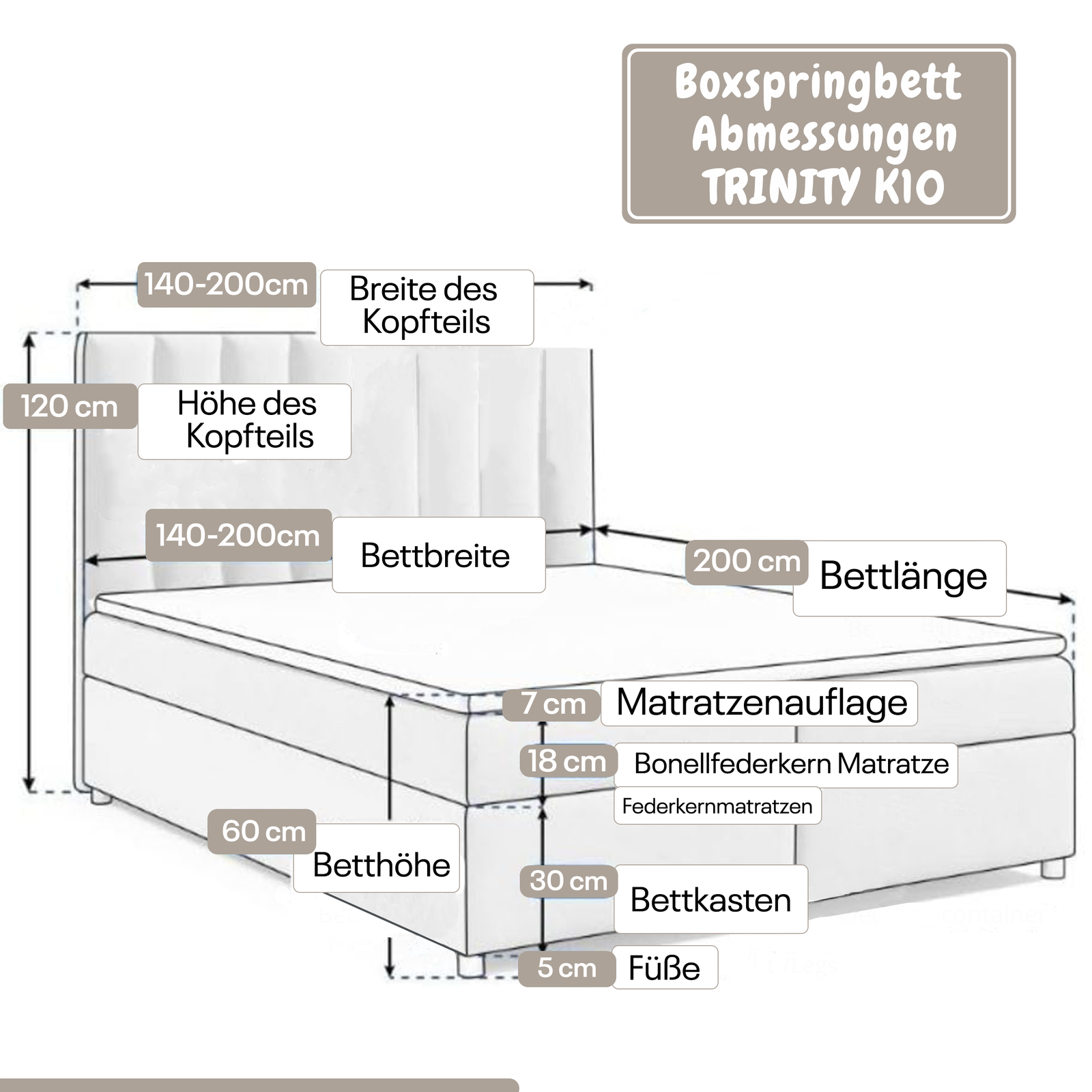 Luxuriöses Design mit hautfreundlichem Trinity-Stoff: Das Boxspringbett besticht durch den weichen, hautfreundlichen Trinity-Stoff, der für ein besonders angenehmes Schlafgefühl sorgt. Die robuste Verarbeitung garantiert eine lange Haltbarkeit und Widerstandsfähigkeit, ohne an Komfort zu verlieren. Der Stoff schafft eine gemütliche und einladende Atmosphäre und sorgt für maximalen Wohlfühlfaktor.