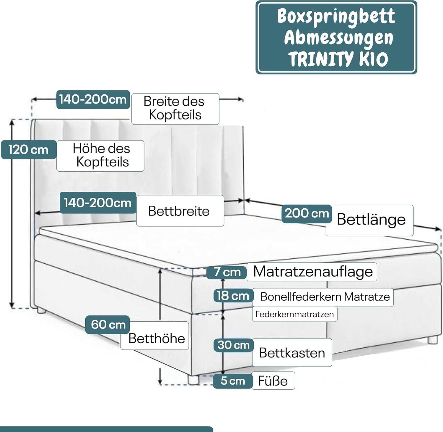 Als Produkt der Marke Best For Home steht das Trinity K-10 für höchste Verarbeitungsqualität, modernes Design und durchdachte Funktionalität. Mit einer Gesamthöhe von ca. 1,2 m und robustem Aufbau ist dieses Boxspringbett nicht nur komfortabel, sondern auch besonders langlebig und pflegeleicht.
