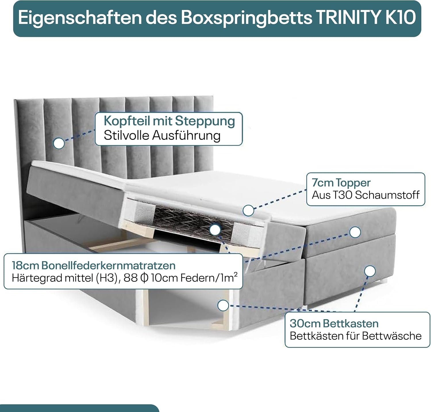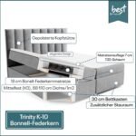 Das Boxspringbett Trinity K-10 mit Bonellfederkern und Topper sorgt für höchsten Liegekomfort und erholsamen Schlaf. Die Kombination aus stabiler Federung, hochwertigem Topper und ergonomischem Aufbau bietet eine optimale Körperanpassung und perfekte Druckentlastung – ideal für gesunden Schlaf und entspannte Nächte.