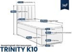 Erhältlich in vier Einzelbettgrößen – 70×200, 80×200, 90×200 und 100×200 cm – passt sich das Trinity K-10 flexibel an Ihre Raumverhältnisse und Bedürfnisse an. Ideal für Jugendzimmer, Gästezimmer oder als stilvolles Einzelbett für Erwachsene. Die Lieferung erfolgt bequem mit allen Komponenten direkt zu Ihnen nach Hause.