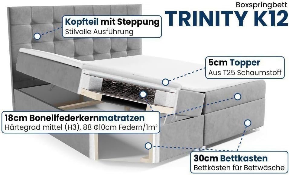 ✔️[𝐄𝐫𝐡ä𝐥𝐭𝐥𝐢𝐜𝐡 𝐢𝐧 𝐯𝐞𝐫𝐬𝐜𝐡𝐢𝐞𝐝𝐞𝐧𝐞𝐧 𝐆𝐫öß𝐞𝐧] Wählen Sie Ihre ideale Größe: Das Trinity Boxspringbett ist in mehreren Varianten erhältlich – 140×200, 160×200, 180×200 und 200×200 cm. Ob als Einzelbett, klassisches Doppelbett oder großzügiges Ehebett – hier finden Sie das passende Modell für Ihr Schlafzimmer. Alle Größen bieten praktischen Stauraum, hochwertigen Trinity-Stoff und ein elegantes Design für höchsten Schlafkomfort und modernes Wohnen.