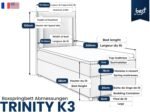 - Chic Kopfteil Design – Eleganz trifft Komfort: Das gepolsterte Kopfteil des Trinity K-3 Betts bietet nicht nur eine königliche Ausstrahlung, sondern auch unvergleichlichen Komfort zum Anlehnen beim Lesen oder Entspannen. Das anspruchsvolle Design des Kopfteils verleiht Ihrem Schlafzimmer einen Hauch von Luxus und verwandelt jede Entspannungszeit in ein unvergessliches Erlebnis. Mit dem Boxspringbett 100×200 mit Bettkasten genießen Sie jede Nacht Komfort und Stil auf höchstem Niveau.