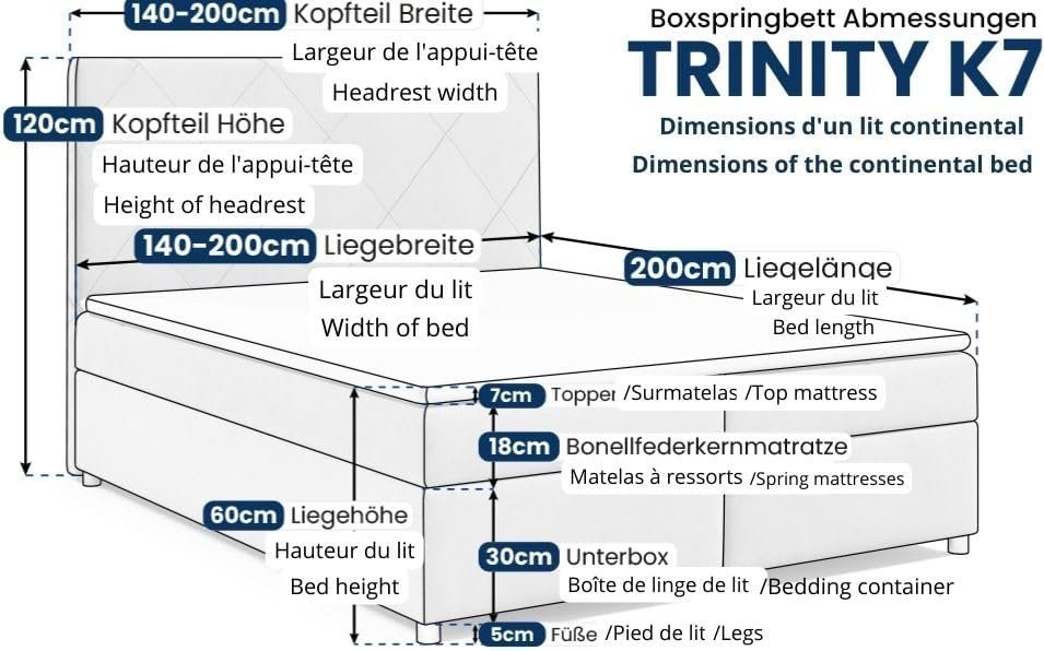 Das Boxspringbett Trinity bietet eine breite Auswahl an Größen, von 140×200 cm bis 200×200 cm, und ist somit für verschiedene Raumgrößen und Bedürfnisse geeignet. Die Gesamthöhe von 60 cm, die Boxhöhe von 30 cm und die Matratzenhöhe von 18 cm machen es ideal für alle, die eine komfortable Einstiegshöhe bevorzugen. Der ca. 5 cm dicke Topper sorgt zusätzlich für eine weiche Oberfläche, die das Liegegefühl noch angenehmer macht. Dieses Bett passt sich Ihren Wünschen an.