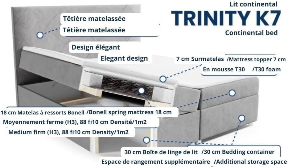 Der hochwertige Trinity-Stoff ist nicht nur hautsympathisch und weich, sondern auch besonders robust und langlebig. Die kuschelige Oberfläche sorgt für ein luxuriöses Gefühl und lädt zum Verweilen ein. Gleichzeitig ist der Stoff pflegeleicht und resistent gegen Abnutzung, sodass das Boxspringbett auch nach langer Nutzung in perfektem Zustand bleibt. Es ist die ideale Wahl für alle, die Wert auf Komfort und ansprechendes Design legen.