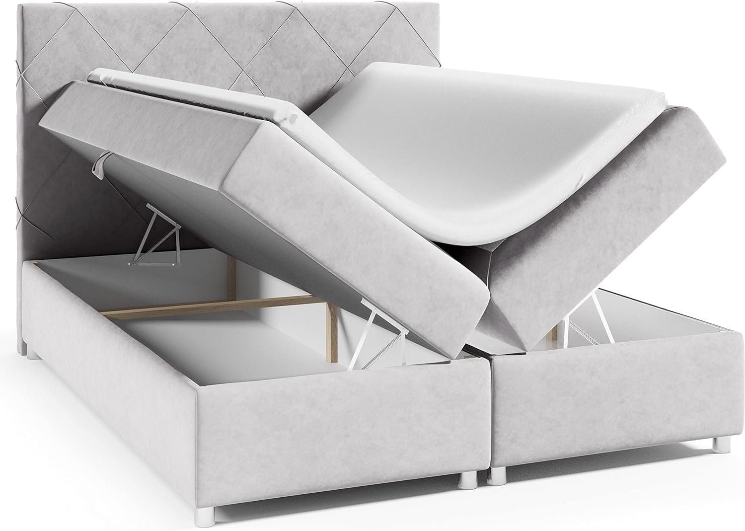 Das Bett mit Stauraum verfügt über zwei seitlich zu öffnende Bettkästen mit integriertem Federmechanismus, sodass Sie diese mühelos durch Ziehen an den Textilgriffen öffnen können. In Bettkästen können Sie Bettwäsche aufbewahren, z. B. Kissen, Bettdecke, Decke oder Bettüberwurf, um Ihr Schlafzimmer ordentlich zu halten.