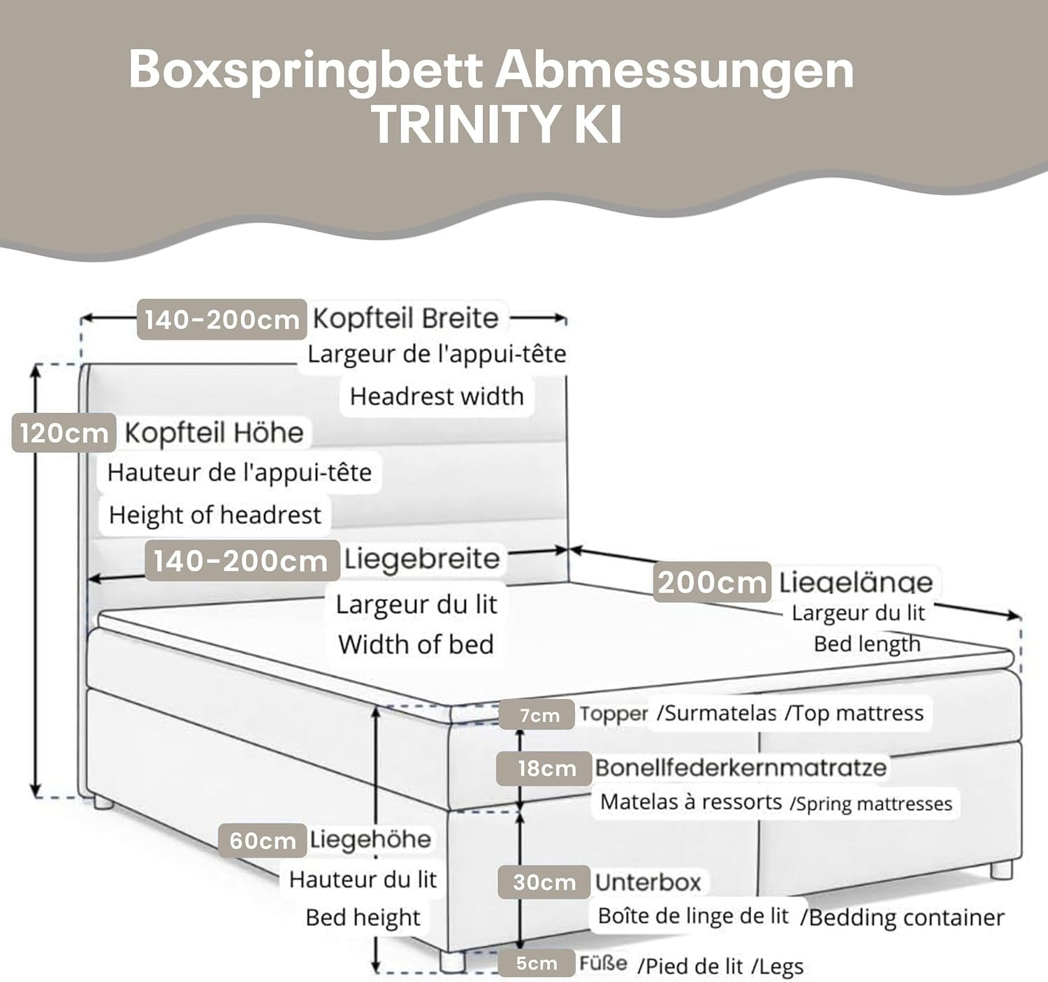 Bequeme Größe 140×200 cm – ideal für Paare oder Alleinschläfer: Die Variante mit einer Liegefläche von 140×200 cm bietet ausreichend Platz für erholsamen Schlaf. Mit Gesamtmaßen von 2,00 m Länge, 1,40 m Breite und 1,20 m Höhe ist dieses Bett nicht nur komfortabel, sondern auch praktisch in der Raumgestaltung – ideal für mittelgroße Schlafzimmer.