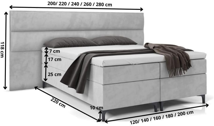 Vielfältige Größen und Maße: Das Boxspringbett ist in verschiedenen Größen von 120×200 cm bis 200×200 cm erhältlich. Die genauen Maße betragen: Liegegestell 59 cm, Box 25 cm, Matratze 17 cm, Topper 7 cm, Füße 10 cm, Nachttisch 40 x 40 x 50 cm. Damit passt das Bett optimal in verschiedene Schlafzimmergrößen und -konzepte.