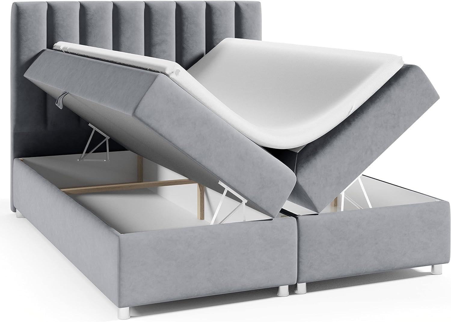 Das Bett mit Stauraum verfügt über zwei seitlich zu öffnende Bettkästen mit integriertem Federmechanismus, sodass Sie diese mühelos durch Ziehen an den Textilgriffen öffnen können. In Bettkästen können Sie Bettwäsche aufbewahren, z. B. Kissen, Bettdecke, Decke oder Bettüberwurf, die Ihr Schlafzimmer ordentlich hält.