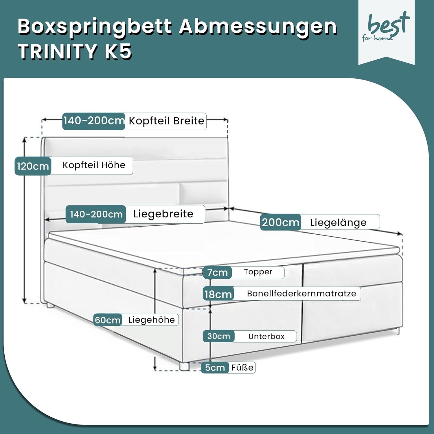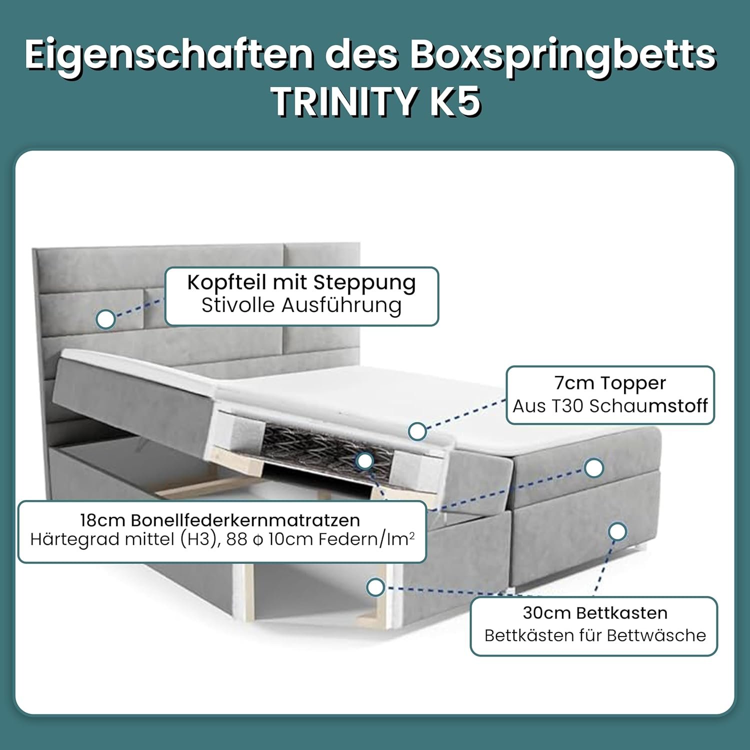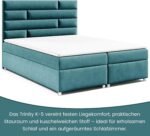 - ✔️【𝐄𝐫𝐡ä𝐥𝐭𝐥𝐢𝐜𝐡 𝐢𝐧 𝐦𝐞𝐡𝐫𝐞𝐫𝐞𝐧 𝐆𝐫öß𝐞𝐧𝐯𝐚𝐫𝐢𝐚𝐧𝐭𝐞𝐧】 Das Trinity K-5 ist erhältlich als Bett 140×200 Boxspringbett, Bett 160×200 mit Stauraum, Bett 180×200 mit Matratze oder sogar als Polsterbett 200×200. Die stabile Konstruktion bietet hohen Liegekomfort und ein modernes Design. Mit Höhen von 58 cm gesamt, 30 cm Box, 18 cm Matratze und ca. 5 cm Topper ist es ein ideal abgestimmtes Boxspringbett 160×200 mit Matratze und Stauraum für jedes Schlafzimmer.