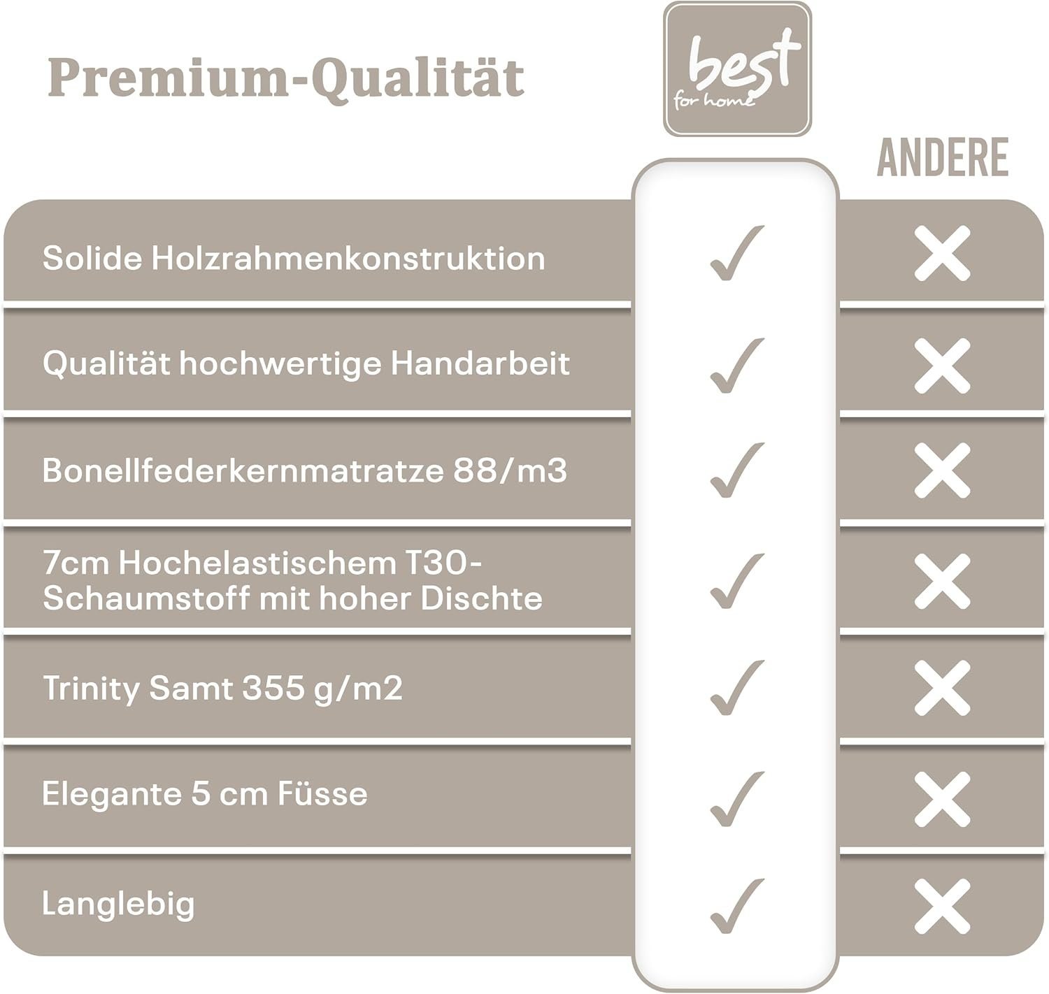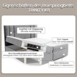 - ✔️【𝐏𝐫𝐞𝐦𝐢𝐮𝐦-𝐊𝐨𝐦𝐟𝐨𝐫𝐭 & 𝐄𝐫𝐠𝐨𝐧𝐨𝐦𝐢𝐬𝐜𝐡𝐞 𝐔𝐧𝐭𝐞𝐫𝐬𝐭ü𝐭𝐳𝐮𝐧𝐠】 Das Best For Home Boxspringbett Trinity K-8 kombiniert einen langlebigen 7-Zonen-Bonell-Federkern mit einer H3-Komfortmatratze (18 cm) und einem ca. 5 cm starken PUR-Schaum-Topper. Diese Kombination sorgt für perfekte Druckentlastung, optimale Körperanpassung und ein harmonisches Liegegefühl. Erhältlich u.a. als Boxspringbett 140×200, 160×200 oder 180×200 sowie als Bett 200×200 mit Matratze – ideal für jedes Schlafzimmer.