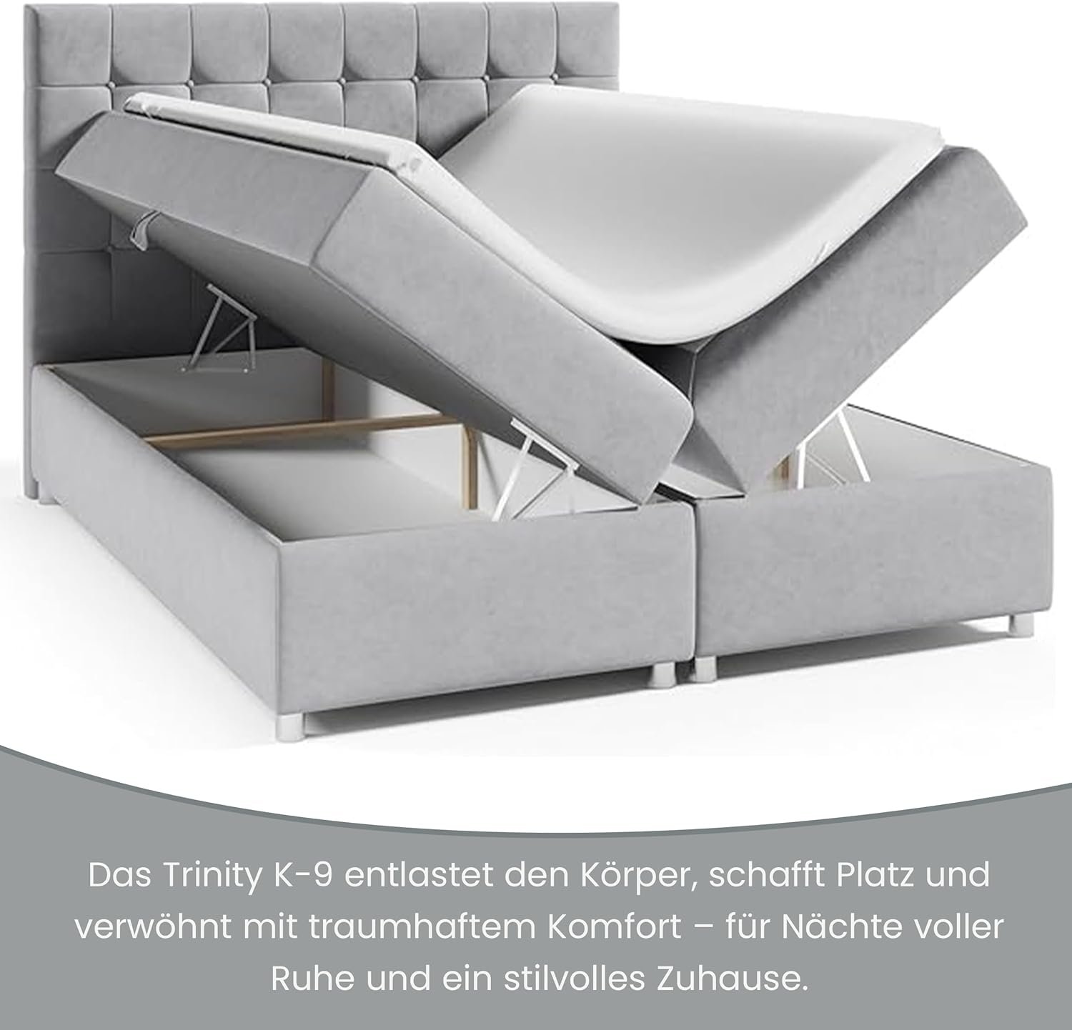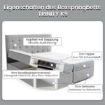 - ✔️ [𝐄𝐫𝐡ä𝐥𝐭𝐥𝐢𝐜𝐡 𝐢𝐧 𝐦𝐞𝐡𝐫𝐞𝐫𝐞𝐧 𝐆𝐫öß𝐞𝐧𝐯𝐚𝐫𝐢𝐚𝐧𝐭𝐞𝐧] Das Trinity K-9 ist erhältlich als Bett 140×200 Boxspringbett, Bett 160×200 mit Stauraum, Bett 180×200 mit Matratze oder sogar als Polsterbett 200×200. Die stabile Konstruktion bietet hohen Liegekomfort und ein modernes Design. Mit Höhen von 58 cm gesamt, 30 cm Box, 18 cm Matratze und ca. 5 cm Topper ist es ein ideal abgestimmtes Boxspringbett 140×200 mit Matratze und Stauraum für jedes Schlafzimmer.