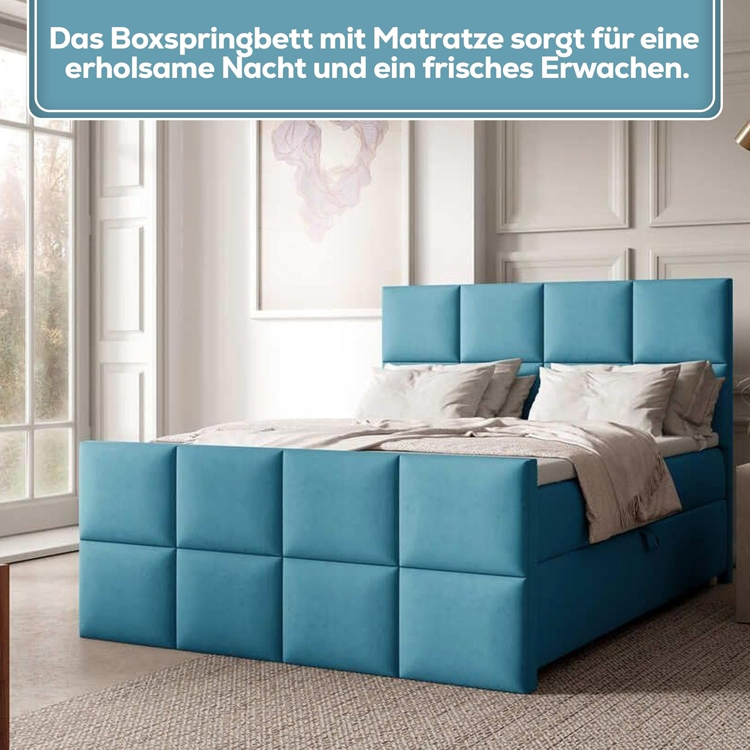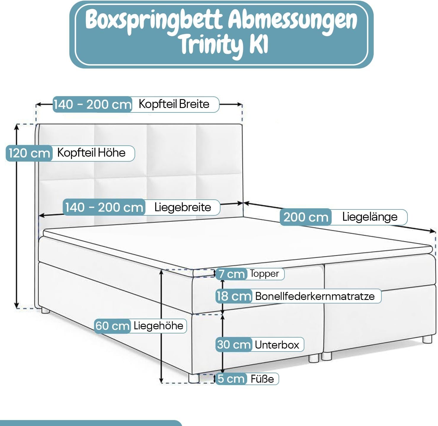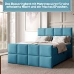 Das Boxspringbett ist mit einem hochwertigen, hautfreundlichen Trinity-Stoff bezogen, der sowohl angenehm weich als auch äußerst strapazierfähig ist. Er verleiht dem Bett eine edle Optik, ist pflegeleicht und sorgt für eine gemütliche, einladende Schlafumgebung – perfekt für stilbewusste Schläfer mit hohen Ansprüchen.