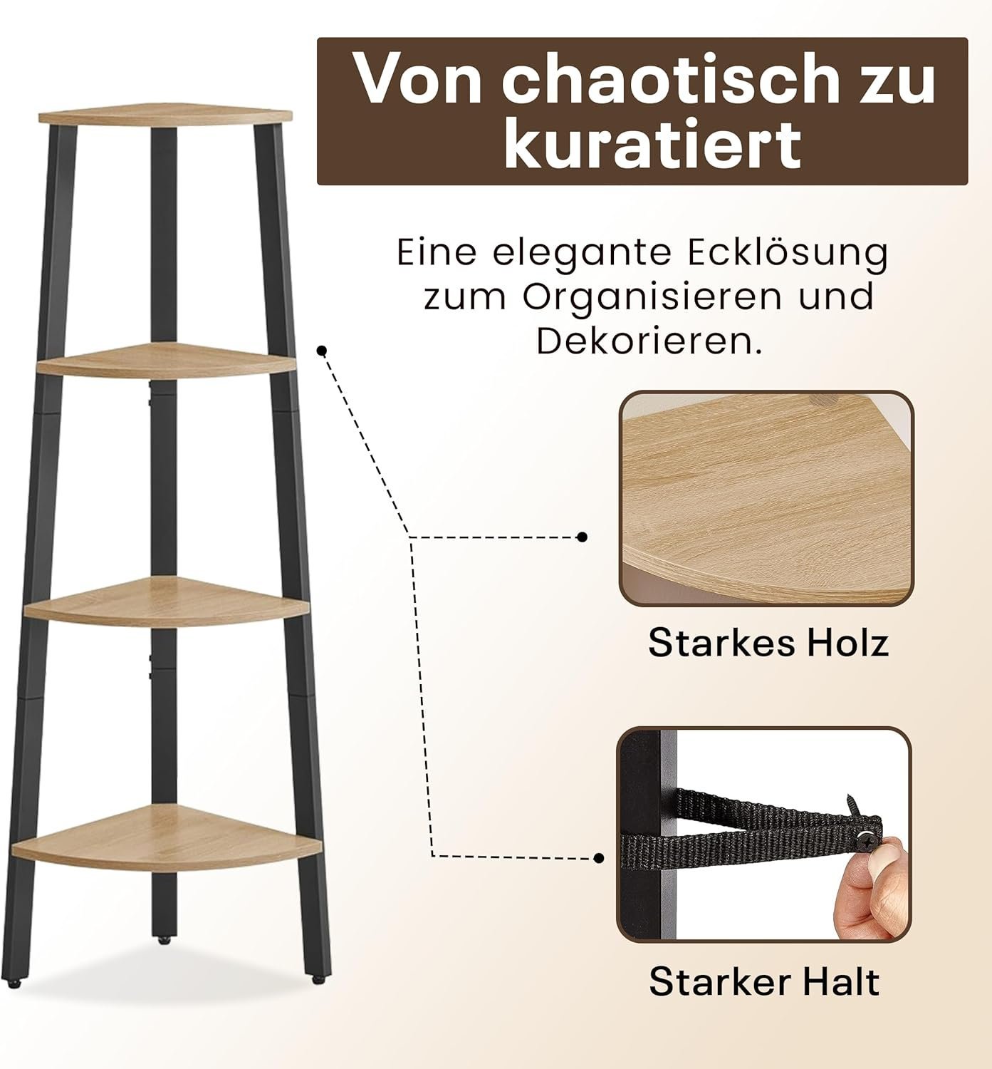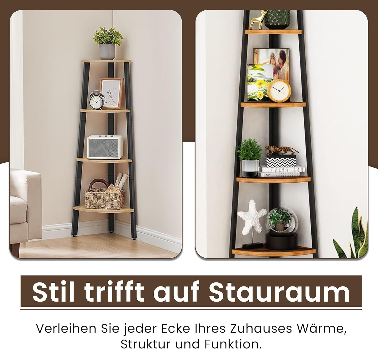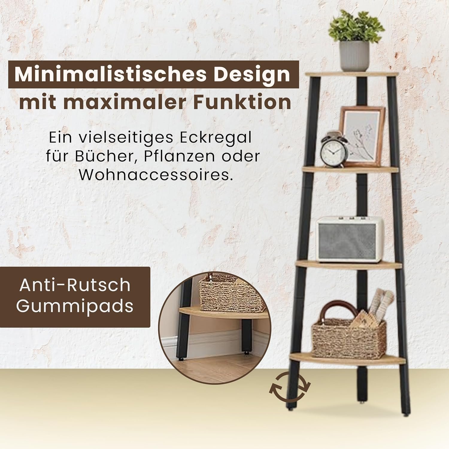 - ✔️【𝐏𝐥𝐚𝐭𝐳𝐬𝐩𝐚𝐫𝐞𝐧𝐝】 Dieses freistehende Eckregal bietet eine clevere, platzsparende Lösung zur Aufbewahrung von Büchern, Vasen oder Dekoartikeln. Mit einem stabilen Metallrahmen und vier großzügigen Ablageflächen passt es perfekt ins Wohnzimmer, den Flur oder das Schlafzimmer. Das vielseitige Regal nutzt selbst enge Ecken optimal aus, sorgt für Ordnung und hält alles griffbereit – und schafft dabei eine offene, aufgeräumte Atmosphäre, in der jeder Zentimeter effizient genutzt wird.