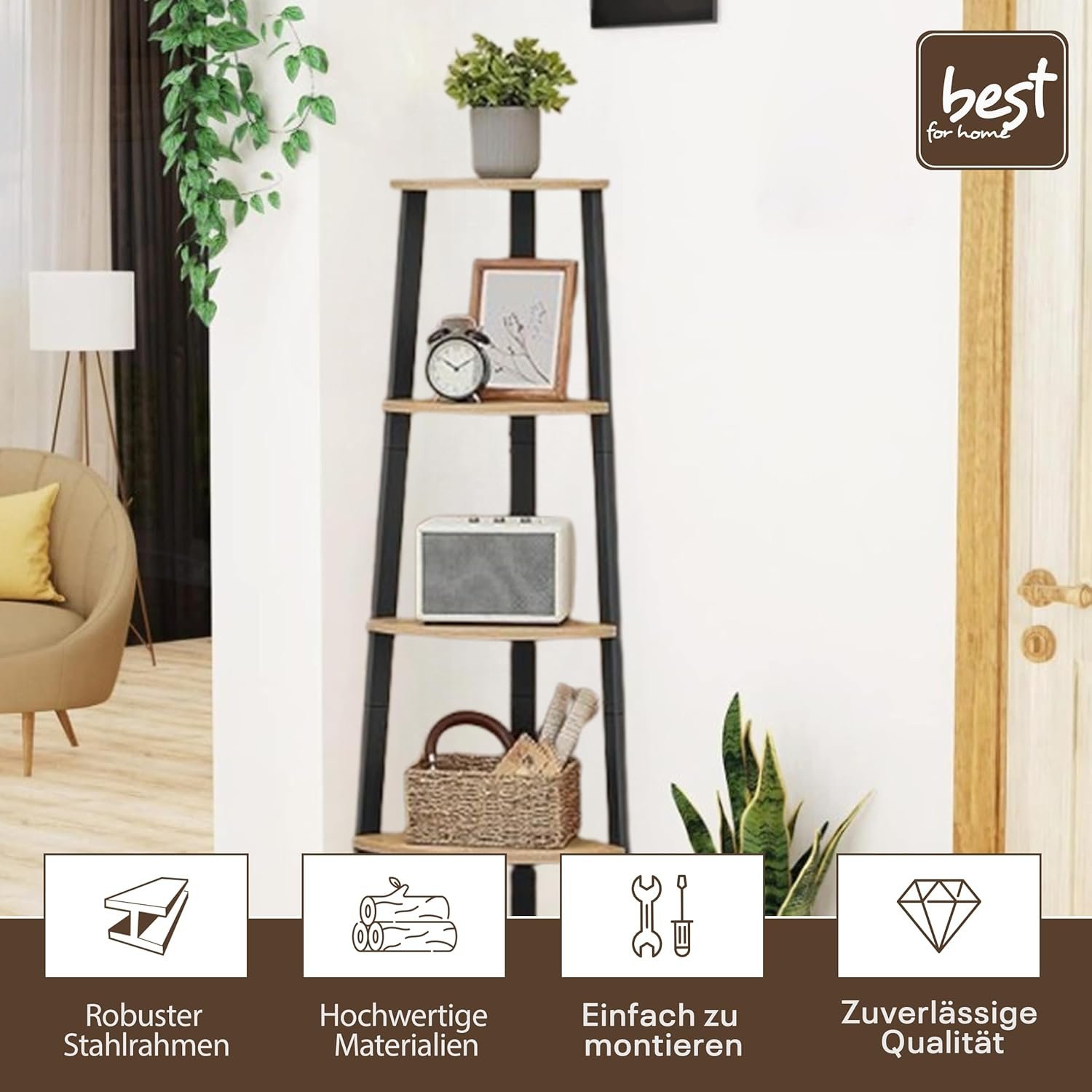 “Best For Home Eckregal – Konisches Standregal mit 4 Ebenen für Wohnzimmer & Büro (30 x 30 x 129,5 cm)”
