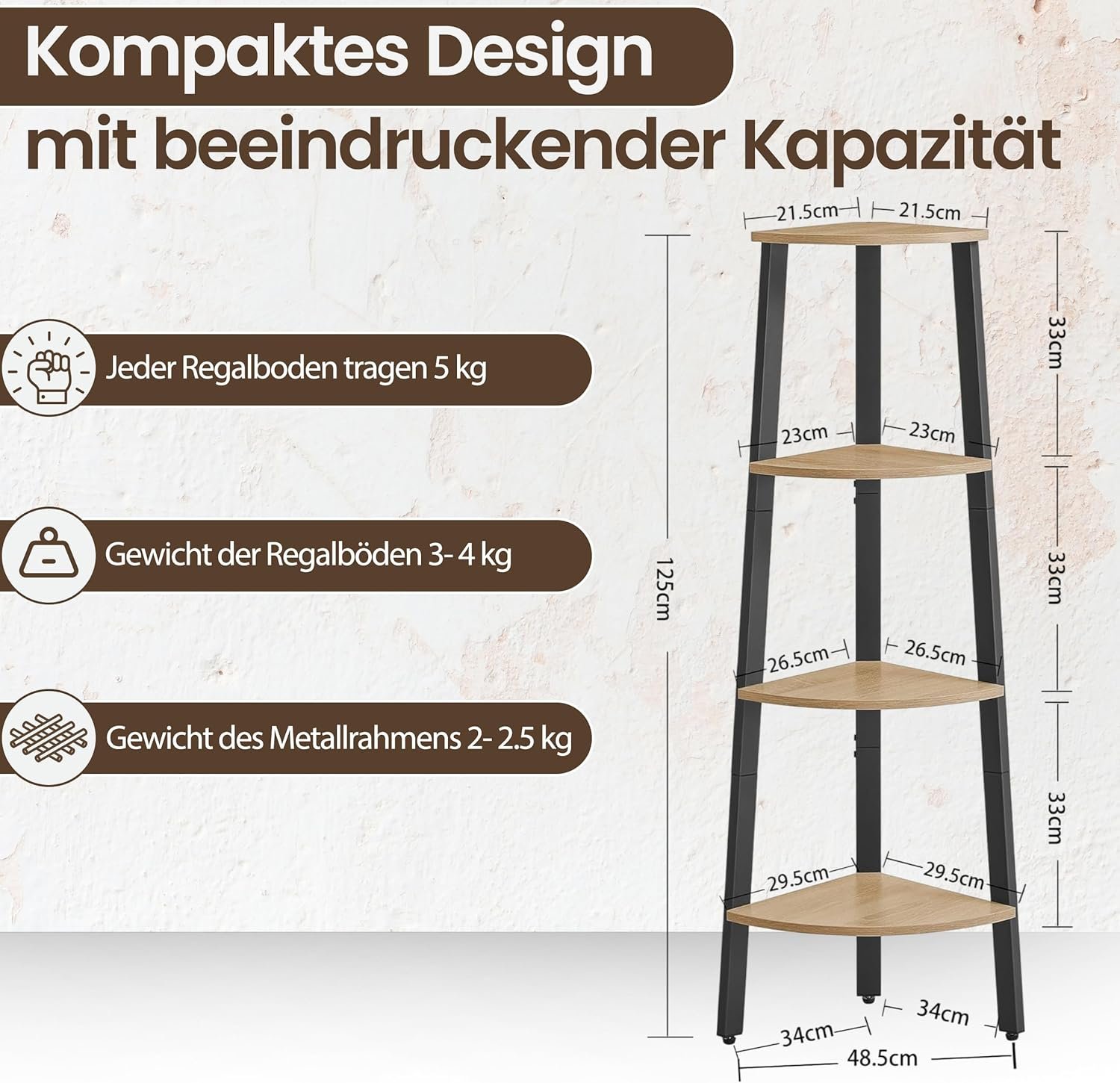 - ✔️【𝐈𝐧𝐭𝐞𝐥𝐥𝐢𝐠𝐞𝐧𝐭𝐞 𝐌𝐚ß𝐞】 Mit kompakten Maßen von 34 cm Tiefe, 48,5 cm Breite und 125 cm Höhe ist dieses Regal in Standardgröße durchdacht konzipiert, um ungenutzte Ecken effizient zu nutzen, ohne den Raum zu überladen. Die moderne Form bietet eine ideale Balance zwischen Stauraum und Platzersparnis – perfekt für Wohnungen oder kleinere Bereiche. Trotz der schlanken Bauweise stellt das Regal großzügigen Stauraum bereit und bewahrt dabei eine klare, minimalistische Optik.