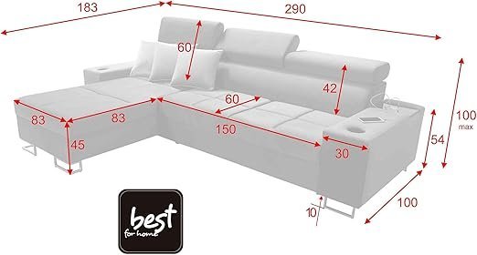 Mit den großzügigen Maßen von 290 cm Breite, 100 cm / 183 cm Tiefe und einer Liegefläche von 226 × 127 cm bietet dieses Ecksofa reichlich Raum für die ganze Familie. Ob zum Sitzen, Liegen oder Kuscheln – hier findet jeder seinen Lieblingsplatz. -