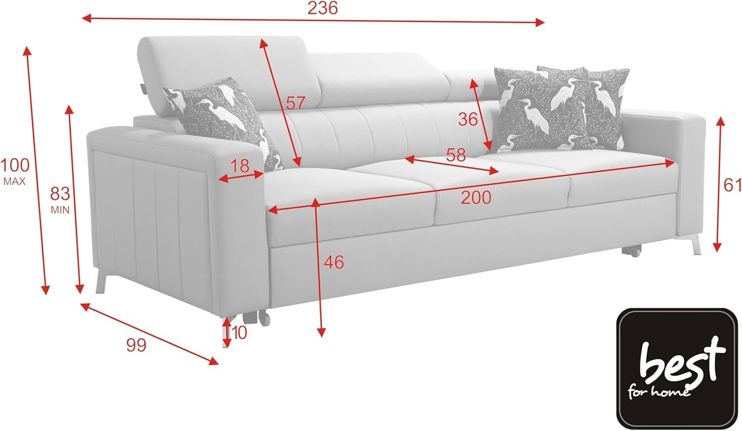 Mit einer Breite von 236 cm, einer Tiefe von 99 cm und einer Liegefläche von 195 x 127 cm bietet das Sofa ausreichend Platz für Entspannung allein oder zu zweit. Die großzügigen Maße schaffen eine gemütliche Atmosphäre und laden zum Verweilen ein.