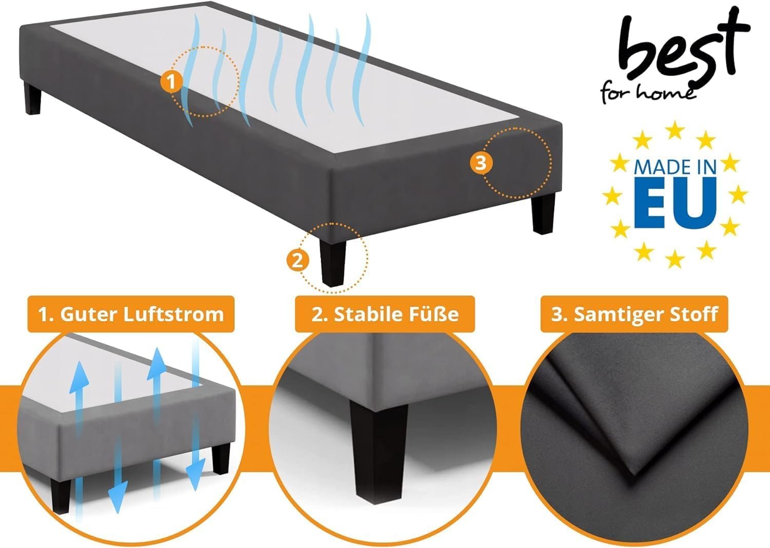 Solide Holzrahmenkonstruktion – Made in EU: Gefertigt aus einem stabilen Massivholzrahmen überzeugt dieses Boxspringgestell durch Langlebigkeit und Detailverliebtheit. Hergestellt in der EU unter höchsten Qualitätsstandards – für ein langlebiges und formstabiles Bettgestell mit hochwertiger Verarbeitung.