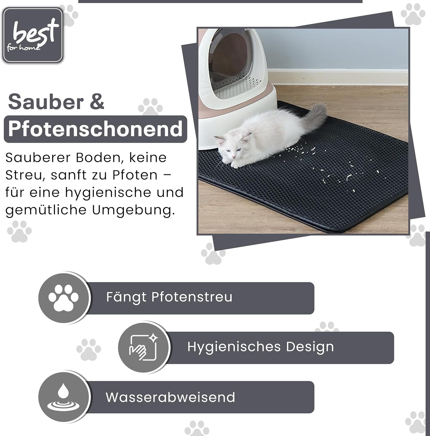 Die Best For Home Katzenklo-Matte verfügt über eine innovative zweilagige Konstruktion, die effektiv Katzenstreu auffängt, das an den Pfoten der Katze haften bleibt. So verhindert sie, dass Streukörnchen sich im ganzen Zuhause verteilen und sorgt für eine saubere und hygienische Umgebung rund um das Katzenklo.