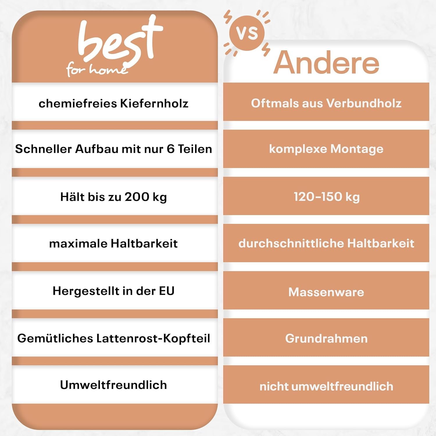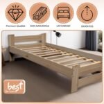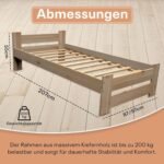- Schnellmontagebett: Unser Massivholzbett ist in verschiedenen Größen erhältlich, darunter 80×200 cm, 90×200 cm, 140×200 cm, 160×200 cm und 180×200 cm, um unterschiedlichen Bedürfnissen gerecht zu werden. Mit Blick auf Benutzerfreundlichkeit besteht das Bett aus nur 6 Teilen, was die Montage zu einer unkomplizierten Aufgabe macht – perfekt für diejenigen, die eine mühelose Einrichtung bevorzugen. Dieses Einzelbett bietet nicht nur hohen Komfort, sondern verfügt auch über einen robusten Bettrahmen, der Langlebigkeit garantiert.