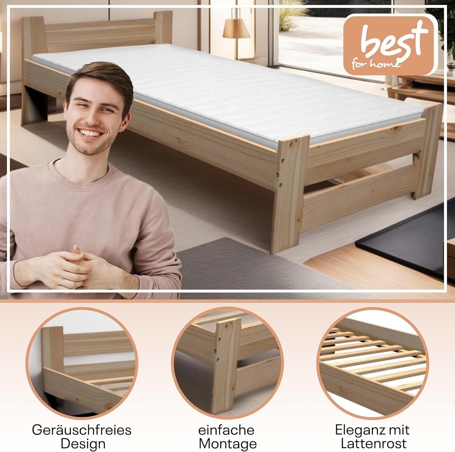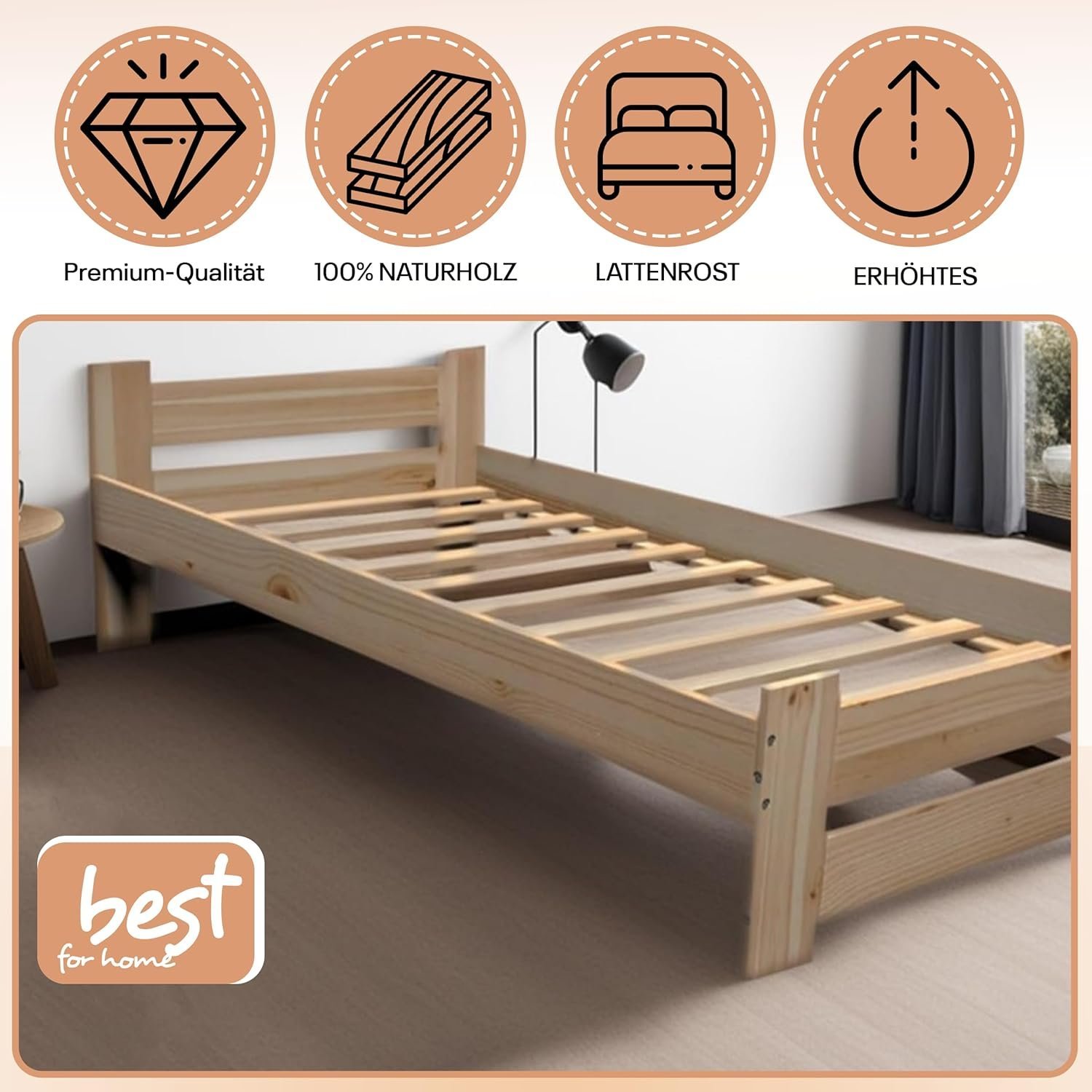 Best For Home – Massivholzbett | Futonbett | Naturholzbett bettgestell | Hochbett aus 100% Naturholz | kopfteil Bett | Bett mit lattenrost Und kopfteil |Seniorenbett | bettgestell (80×200 cm)