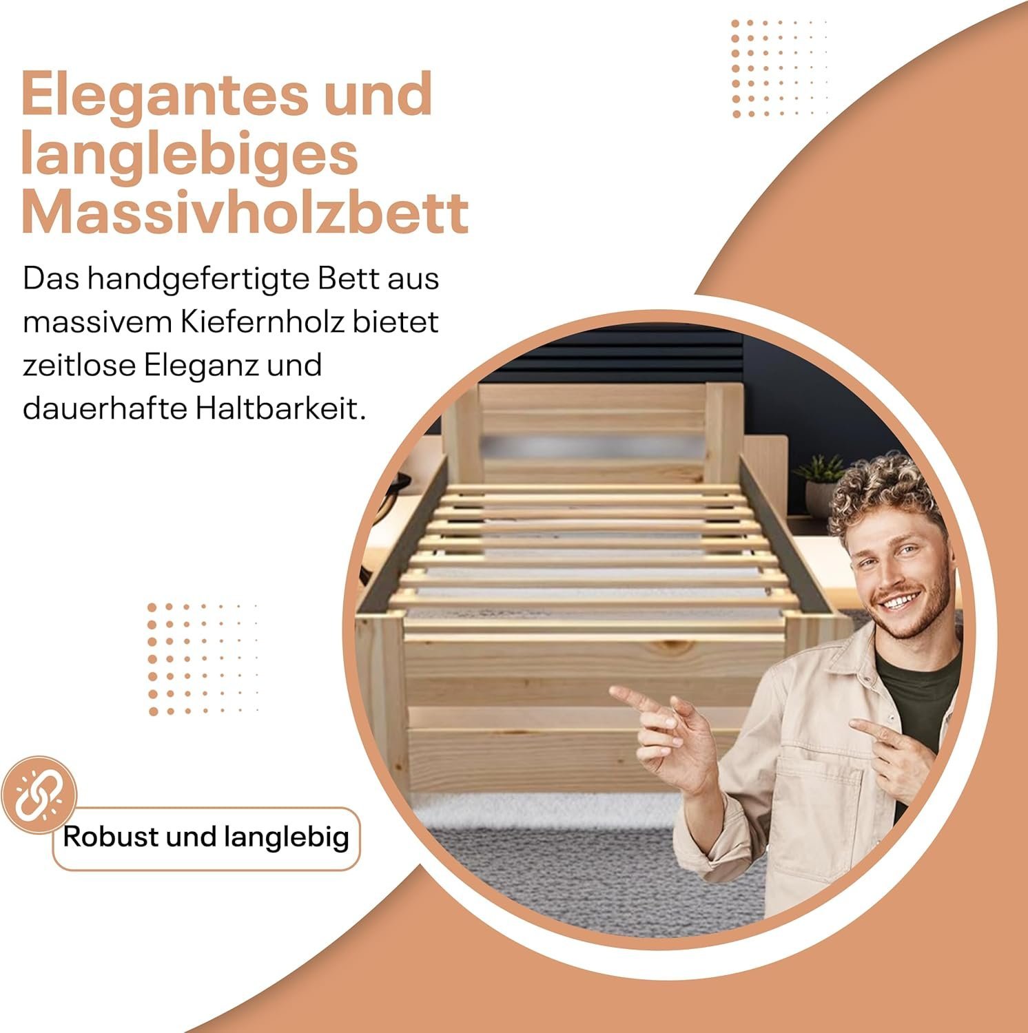 - Natürliches Massivholz: Unser Bett besteht aus 100 % purem Holz ohne Lacke und Chemikalien. Es eignet sich hervorragend für ein zeitloses Holz-Bett und kann mit einem eleganten Kopfteil für zusätzlichen Komfort kombiniert werden. Unser Bettgestell vereint Robustheit und Stil. Entdecken Sie auch unser vielseitiges Bettgestell, das sich perfekt in jede Raumgestaltung einfügt. Genießen Sie die natürliche Schönheit und Langlebigkeit dieses handgefertigten Bettes, das nicht nur funktional, sondern auch ästhetisch ansprechend ist.