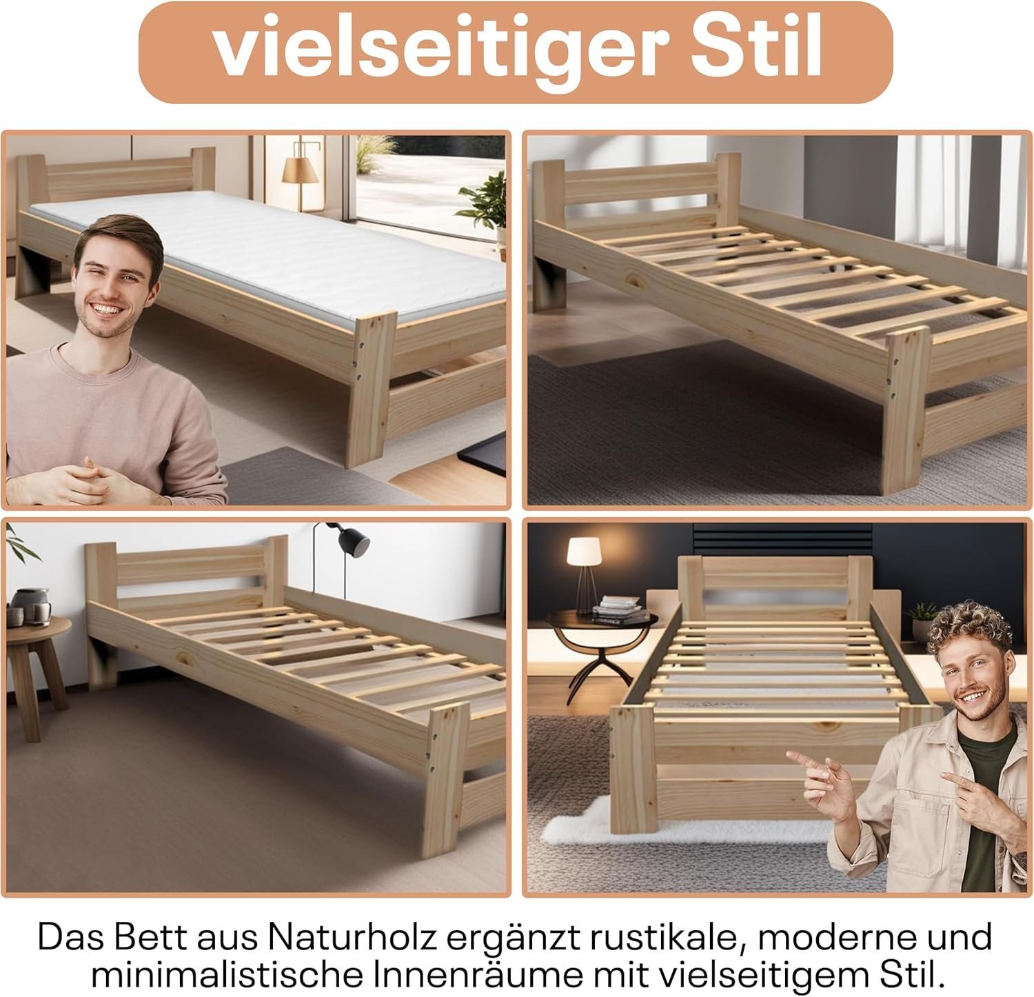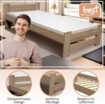 - Massivholzbett – Handgefertigte Qualität: Aus massivem Kiefernholz gefertigt, vereint dieses Bett Langlebigkeit und elegantes Design. Der stabile Rahmen sorgt für dauerhafte Stabilität, während das bequeme Futon-Design es ideal für verschiedene Räume macht. Die zeitlose Ästhetik wertet jeden Raum auf, und das stilvolle Kopfteil verleiht einen Hauch von Luxus, wodurch eine gemütliche Atmosphäre entsteht. Genießen Sie die perfekte Kombination aus Komfort und Eleganz, die dieses handgefertigte Massivholzbett in Ihr Zuhause bringt.