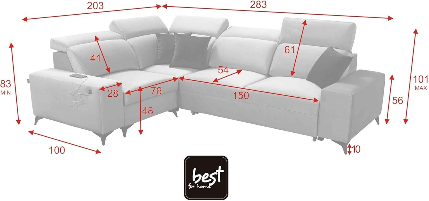 Mit einer beeindruckenden Breite von 283 cm, einer Tiefe von 100 cm / 203 cm und einer Klappfläche von 202 cm x 122 cm bietet dieses Ecksofa Platz für Familie, Freunde und erholsame Stunden. Ob zum Sitzen, Liegen oder Schlafen – hier genießen Sie ausreichend Raum für Entspannung und Komfort in jeder Lebenslage.
