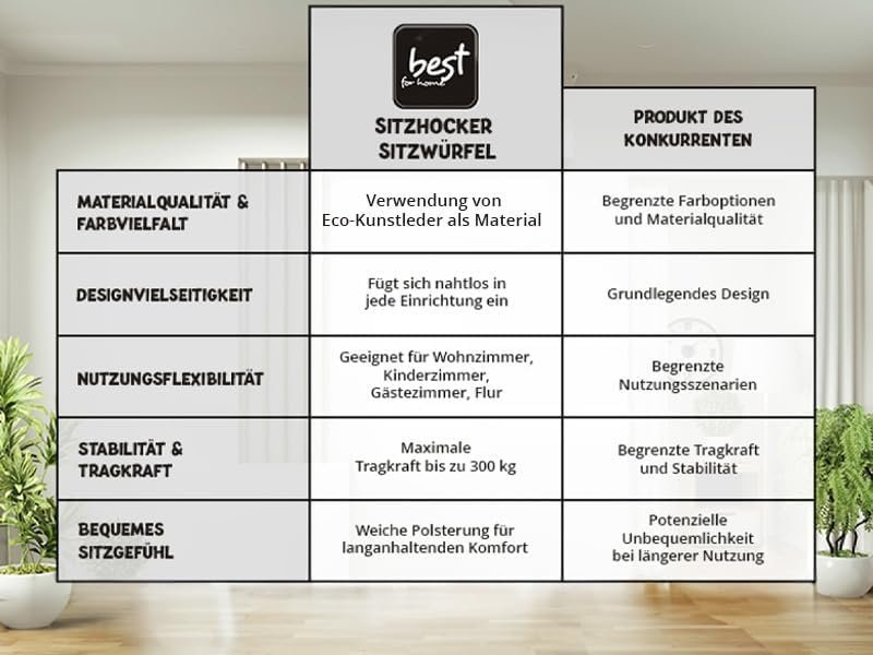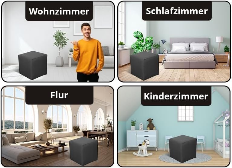 Info zu diesem Artikel Trendiger Sitzwürfel aus hochwertigem Kunstleder in verschiedene Farben – Das schlicht-funktionale Design fügt sich in jede Einrichtung Fr Wohnzimmer, Kinderzimmer, Gästezimmer oder Flur – Wählen Sie Ihre Lieblingsfarbe! Stabile Sitzgelegenheit für Kinder und Erwachsene – Perfekt bei Besuch – Der Sitzwürfel ist robust verbaut und verfügt über eine zusätzliche MDF Platte zu Stabilisierung – Maximal belastbar bis 300 kg Das weiche Kunstleder auf der Sitzfläche sorgt für ein angenehmes Sitzgefühl – Auch nach längerem Sitzen fühlt sich die Oberfläche bequem an – Der Stoff ist zudem sehr belastbar und widerstandsfähig Maße aufgebaut H: 40 cm x B: 40 cm x T: 40 cm