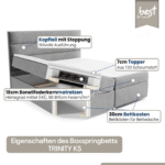 Be the first to review “Best For Home – Trinity K-5 Boxspringbett | Boxspringbett mit Bettkasten | Boxspringbett mit Matratze und Topper | Polsterbett 180×200 | Boxspringbett 180×200 | Boxspringbett mit Lieferung, Aufbau & Entsorgung” Cancel reply