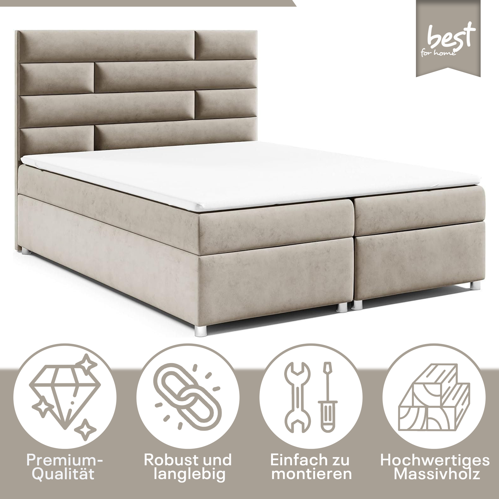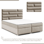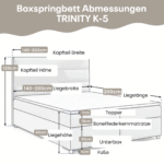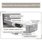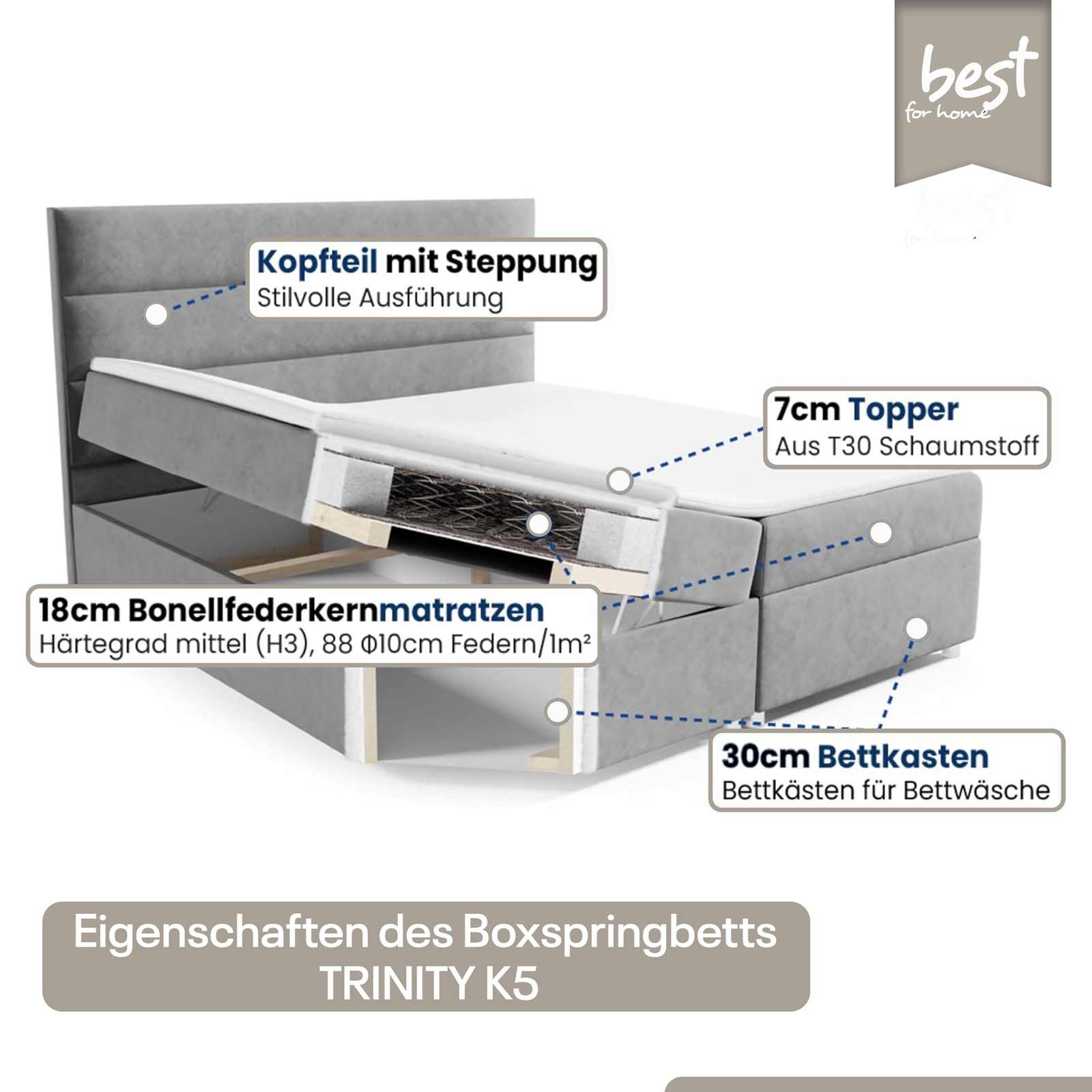 Das Best For Home Boxspringbett Trinity K-5 vereint außergewöhnlichen Komfort und Funktionalität mit seinem Bonellfederkern-System und dem praktischen Bettkasten für zusätzlichen Stauraum. Dieses hochwertige Boxspringbett wird inklusive komfortablem Topper geliefert und sorgt so jederzeit für einen erholsamen Schlaf. Das moderne Design und die robuste Konstruktion machen es zur idealen Wahl für jedes Schlafzimmer und bieten sowohl Stil als auch Halt. Und dank der schnellen Lieferung können Sie sich ohne Verzögerung an Ihrem neuen Bett erfreuen. Erleben Sie die perfekte Mischung aus Komfort, Qualität und Bequemlichkeit mit dem Trinity K-5 Boxspringbett.