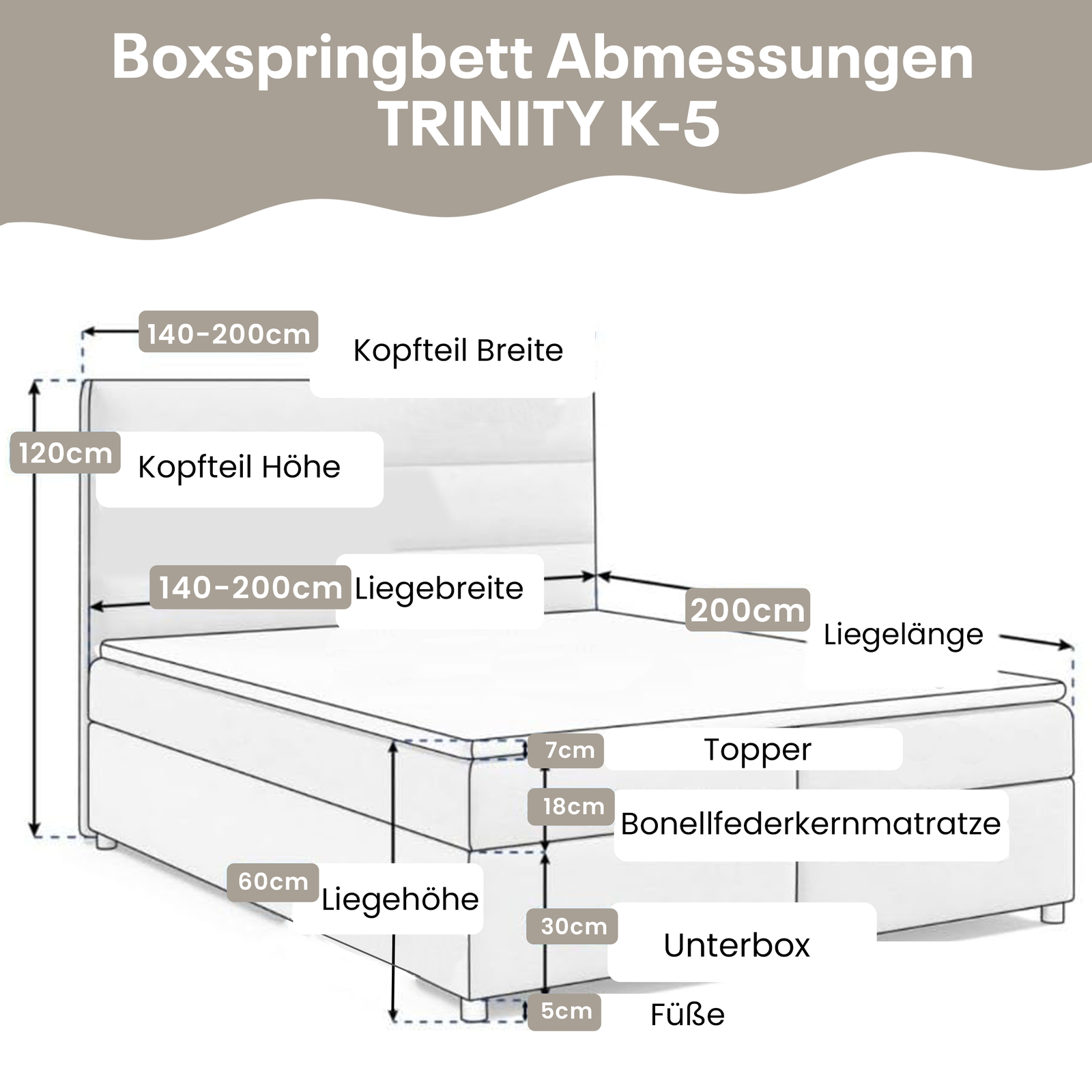 Dieses Bett zeichnet sich durch seinen weichen, langlebigen und pflegeleichten Trinity-Stoff aus. Der hautfreundliche Stoff bietet ein angenehmes, kuscheliges Gefühl und macht das Boxspringbett zur perfekten Wahl für alle, die Wert auf Komfort und Stil legen. Der Stoff ist zudem strapazierfähig und behält auch bei täglichem Gebrauch seine hochwertige Optik und Haptik. - Komfort und Stil in verschiedenen Größen: