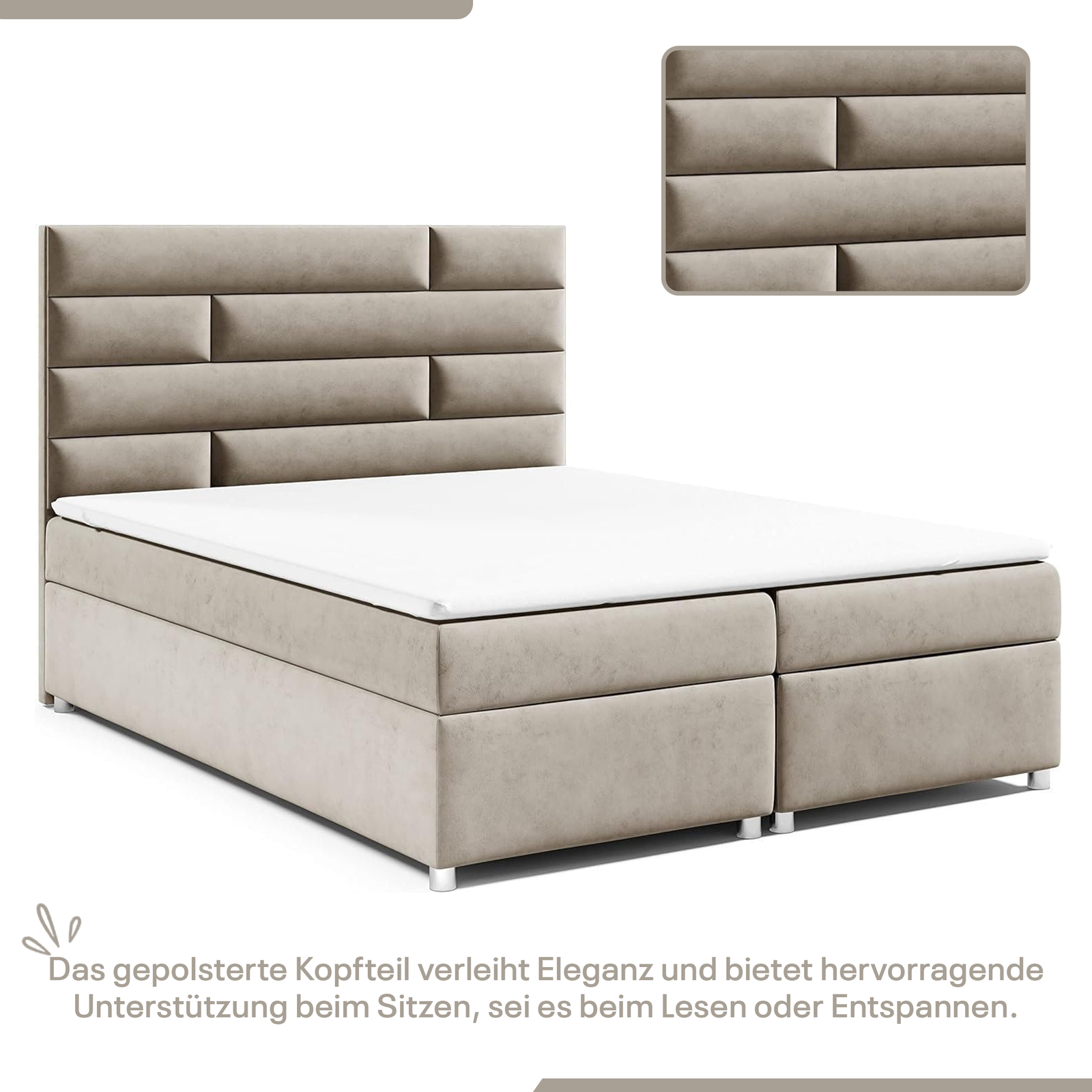 Dieses Boxspringbett mit Stauraum vereint Stil und Funktionalität. Die zwei geräumigen Bettkästen bieten Ihnen die Möglichkeit, Bettwäsche, Kissen oder saisonale Kleidung ordentlich und platzsparend zu verstauen. Dank des durchdachten Federmechanismus lässt sich der Stauraum mühelos öffnen und schließen. Die Stauraumbetten 140×200 sind perfekt für kleinere Schlafzimmer oder Wohnungen, in denen zusätzlicher Platz benötigt wird. - Luxuriöses Gefühl mit hautfreundlichem Trinity-Stoff: