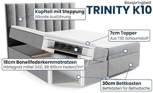 • Luxuriöses Gefühl mit hautfreundlichem Trinity-Stoff: Dieses Bett mit Matratze bietet einen Hauch von Luxus durch den hautfreundlichen, weichen und kuscheligen Trinity-Stoff. Die robuste Verarbeitung des Polsterbetts sorgt für Langlebigkeit und Widerstandsfähigkeit gegen den täglichen Gebrauch, ohne an Weichheit zu verlieren. Der Trinity-Stoff des Boxspringbetts ist sanft zur Haut und schafft eine gemütliche, einladende Schlafumgebung.