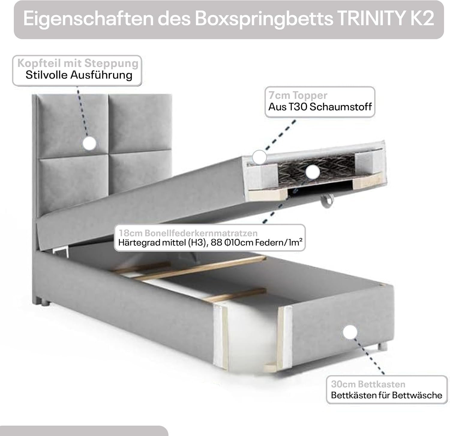 - Premium Komfort und Design: Erleben Sie das exklusive Boxspringbett Trinity K2 in verschiedenen Größen (70×200, 80×200, 90×200, 100×200 cm). Dieses stilvolle Polsterbett vereint Komfort mit Funktionalität und ist ideal für jedes Schlafzimmer. Mit einem robusten Bonellfederkern und einem praktischen Bettkasten bietet es nicht nur außergewöhnlichen Schlafkomfort, sondern auch wertvollen Stauraum für Bettzeug und persönliche Gegenstände.