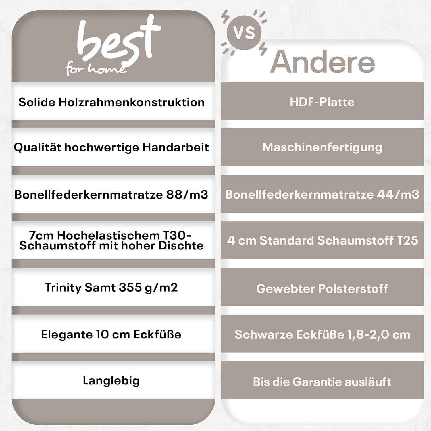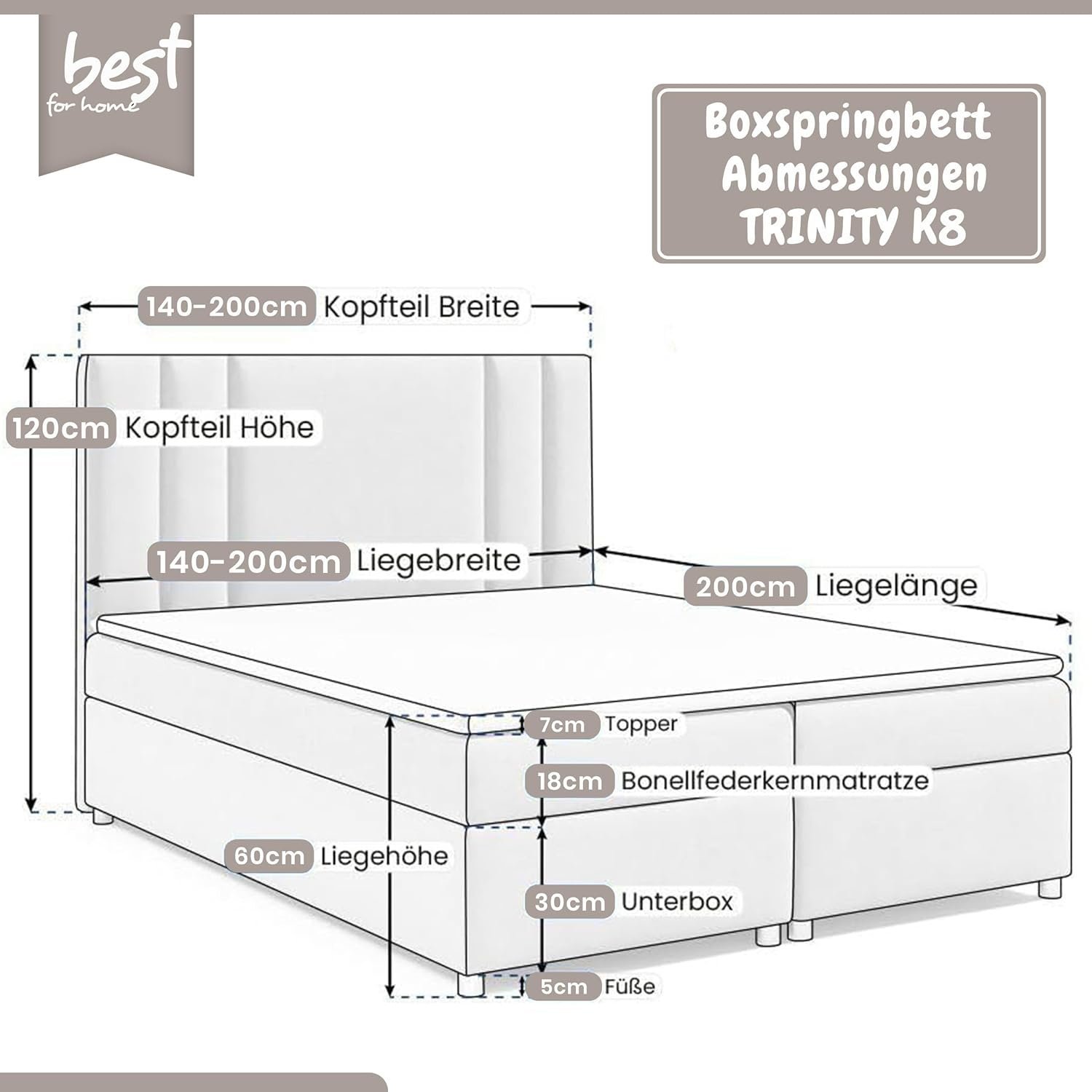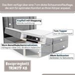 - Optimaler Komfort für jede Größe: Das Boxspringbett Trinity K8 Lux von Best for Home bietet hervorragenden Schlafkomfort mit einer 18 cm hohen 7-Zonen-Matratze und Bonnellfedern für individuelle Unterstützung. Der Härtegrad H3 vereint Festigkeit und Komfort, während der ca. 5 cm dicke PUR-Schaumstoff-Topper zusätzliche Weichheit bietet. Das elegante Design fügt sich harmonisch in jedes Schlafzimmer ein und steigert Ihre Entspannung und Ihr Wohlbefinden für einen erholsamen Schlaf.