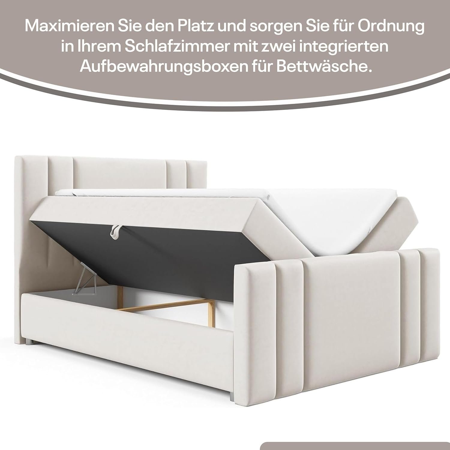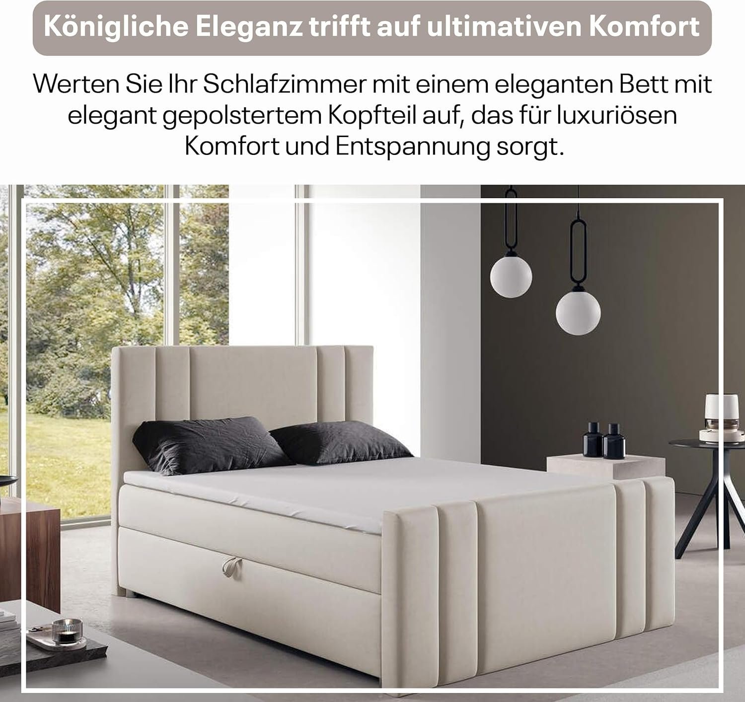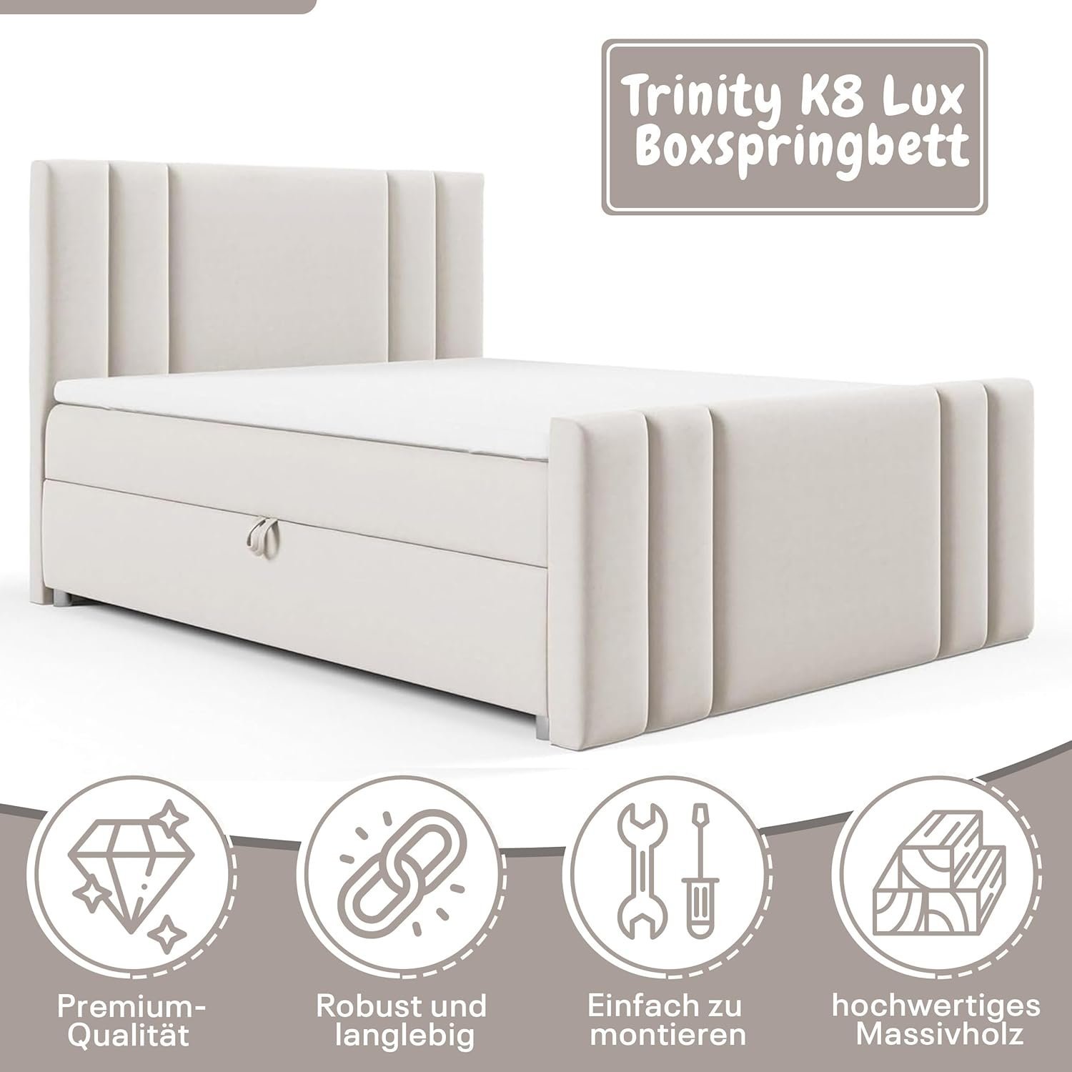 - Praktische Bettkästen mit Federmechanismus: Das Boxspringbett Luxus Trinity K8 von Best for Home bietet zwei große Bettkästen mit Federmechanismus für einfachen Zugang. Diese Kästen bieten Stauraum für Bettwäsche und Textilien, was die Funktionalität des Bettes erhöht. Der weiche, kuschelige Stoff Trinity verleiht dem Bett eine elegante Optik und zusätzlichen Komfort. Mit seinem stilvollen Design passt es harmonisch in jedes Schlafzimmer und sorgt für ein ansprechendes Ambiente.