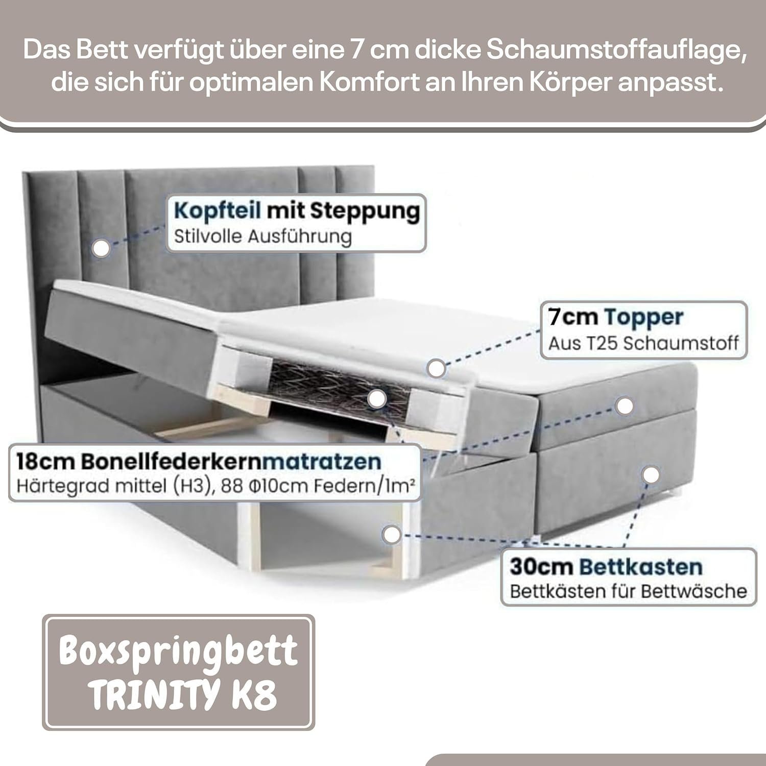 Trinity K8 Lux Boxspringbett Über diesen Artikel 7-Zonen Bonel Federkernmatratze , 18 cm hoch. Härte H50 Der 7 cm lange Topper besteht aus einem Polyurethanschaum. Enthält zwei Aufbewahrungsboxen mit integriertem Federmechanismus für Bettwäsche. Hergestellt aus hautfreundlichem, weichem und anschmiegsamem Trinity-Stoff. Robuste Verarbeitung Größe: 140 x 200 – 200 x 200 cm zur Auswahl. Bettrahmen: 60 cm, Box: 30 cm, Matratze: 18 cm, Topper: 7 cm, Füße: 5 cm